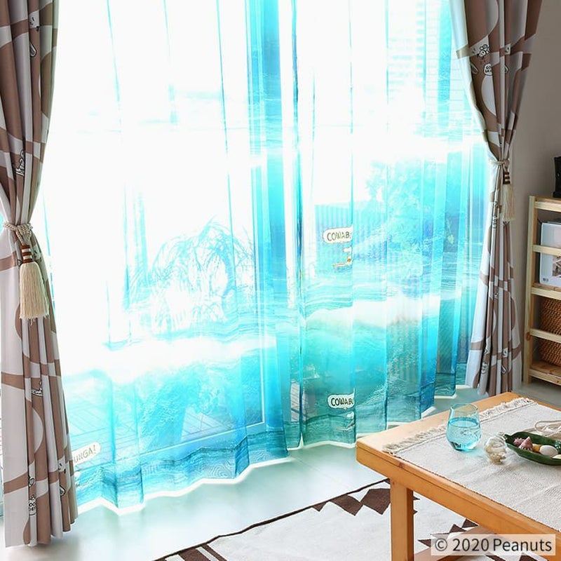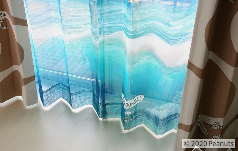 まるで本物の海が広がるような壮大なデザインとスヌーピーが描かれたレースカーテン