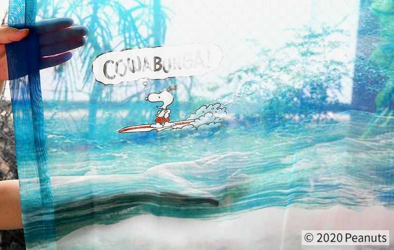 美しい海をスヌーピーが波乗りしている壮大なレースカーテン