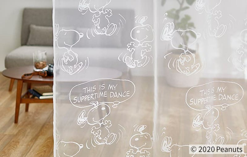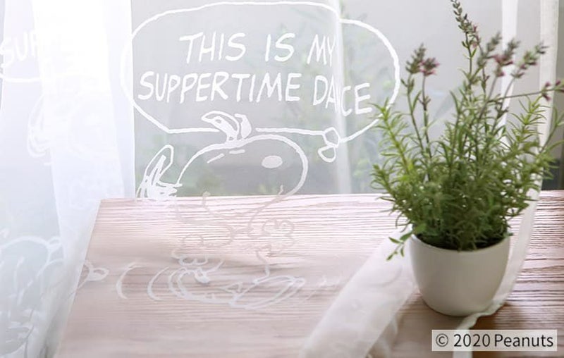 待ちわびた夕食の時間に、喜びのダンスを披露するスヌーピーがデザインされたカーテン。
