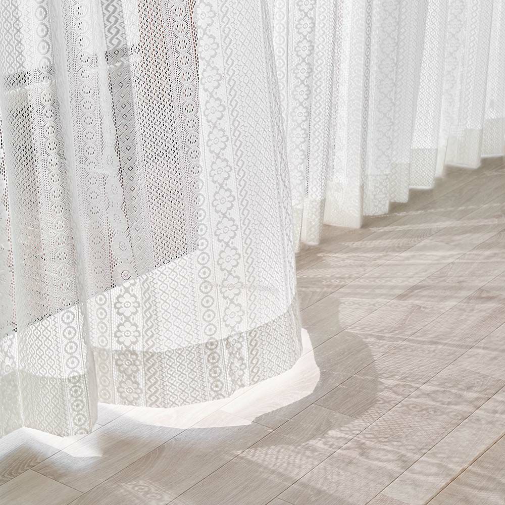 細い糸を使って編むことで模様が生み出される編みデザインのレースカーテン。ほどよい甘さを感じる小さなお花と、幾何学柄が連なるデザインは、どこかレトロで懐かしい雰囲気。窓辺の程よいアクセントとなって、レトロ可愛いお部屋を演出してくれます。