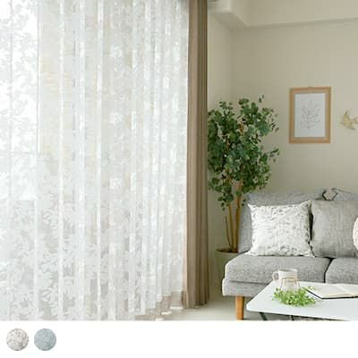心安らぐリーフデザインが映える、優しい色合いと軽やかな透け感が特徴のラッセル編みレースカーテンです。ほっと心落ち着く、癒やしの窓辺に。