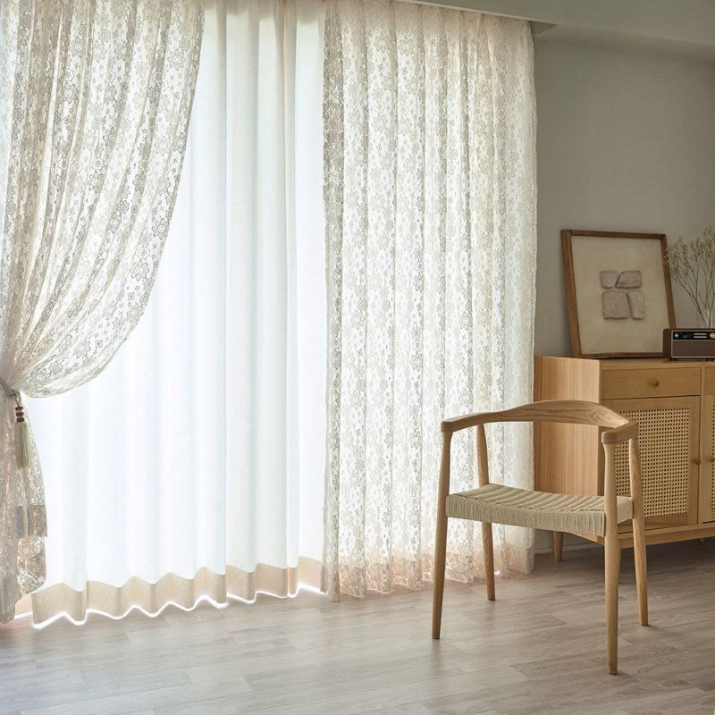 フロントレーススタイルとは、ドレープカーテンの前にレースを掛けて、レースを主役にしたコーディネート。その中でもディレクターのおすすめは、非遮光カーテンとの組み合わせ。優しく光が透け、編みレースの立体感もほどよく感じられる。タッセルでまとめるだけでも、お部屋にこなれ感をプラスしてくれます。