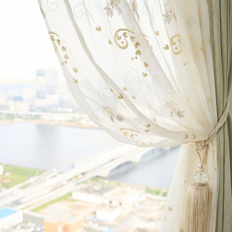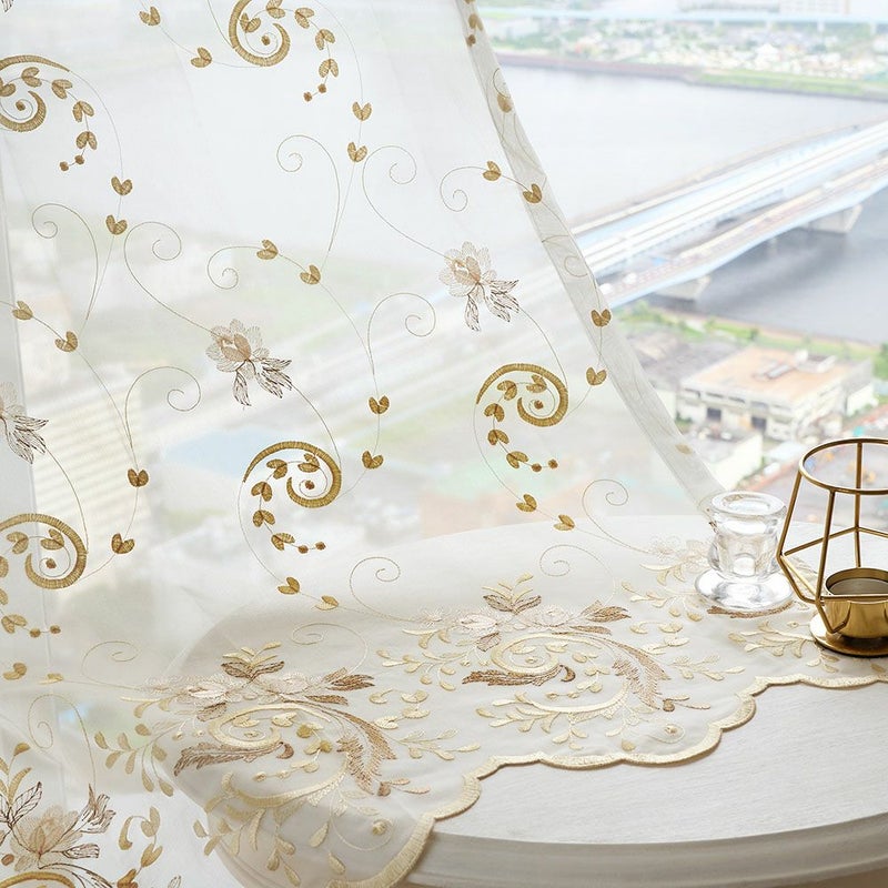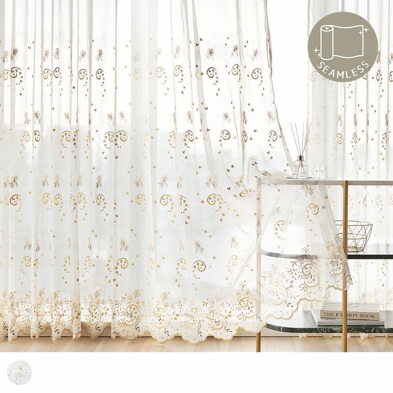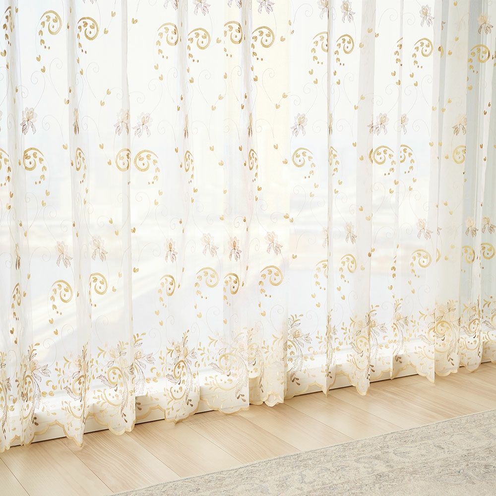 艶のあるシャンパンゴールドの刺繍で施された贅沢な裾のスカラップ仕上げが、上品で女性的な雰囲気を演出してくれます。お気に入りの窓辺にふさわしい、裾まで拘り抜いた1枚です。