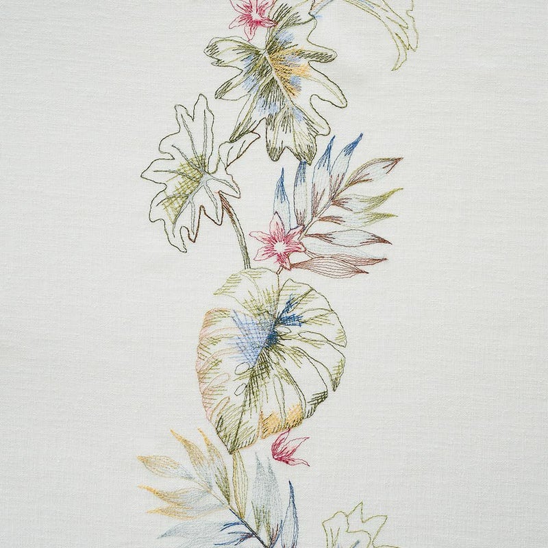 多様なかたちのモンステラを縦に連ねて1本のデザインに。さらにそれを横に並べてストライプ状に施しました。まるでツタのように伸びやかに描かれた刺繍たちが、上品ながらもアクティブなお部屋を演出してくれます。