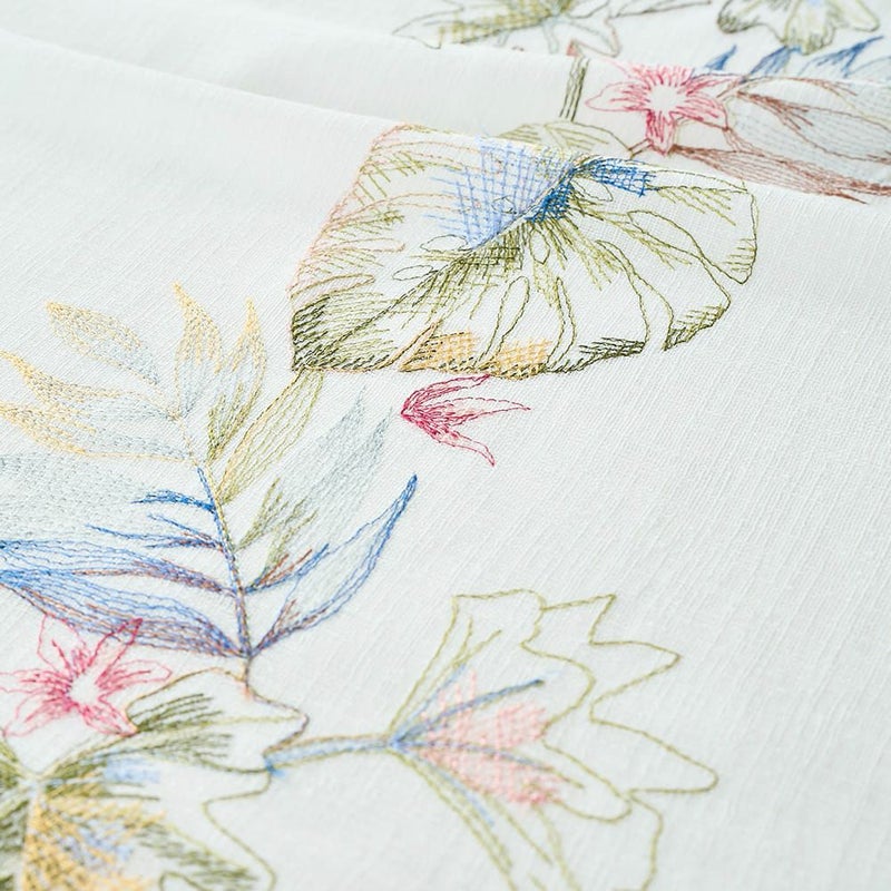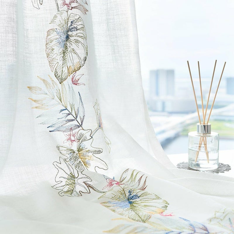 心を癒すボタニカルな雰囲気と女性らしい上質さ、どちらも叶えるレースカーテンが登場しました。9色もの刺繍糸で表現されたモンステラは、グラデーションのような色の移ろいまで緻密に表現しています。上質なボタニカルレースカーテンで、クラフト感漂うハワイアンインテリアに。