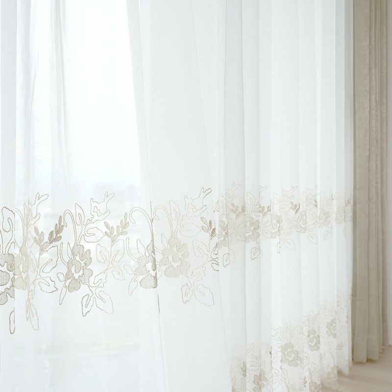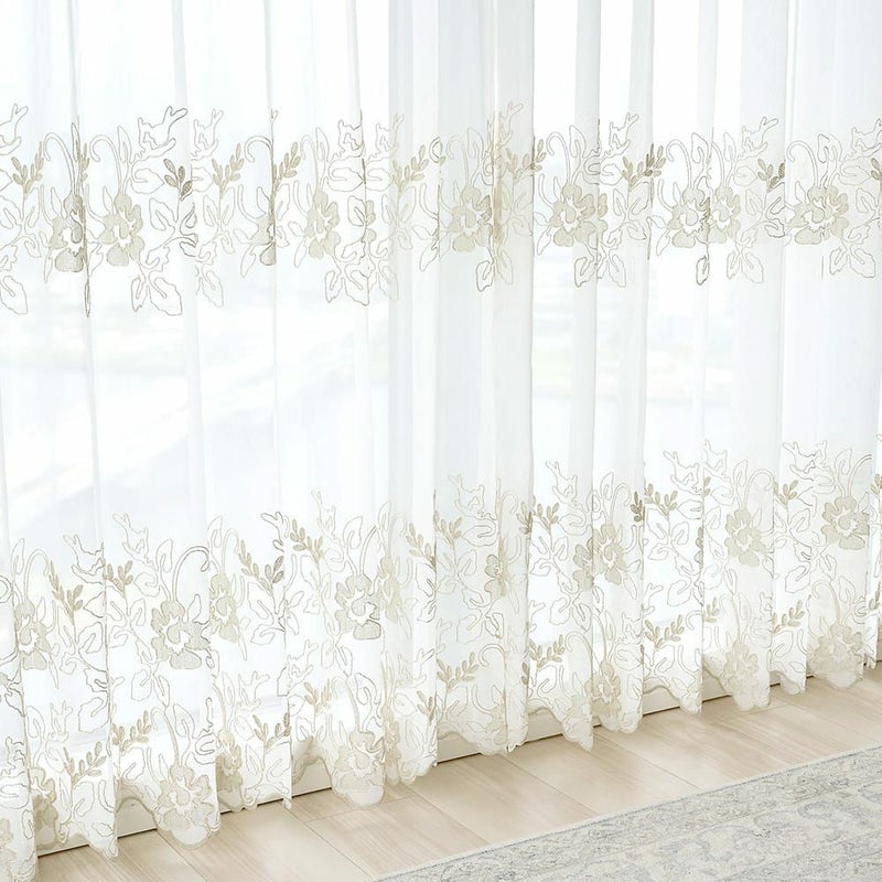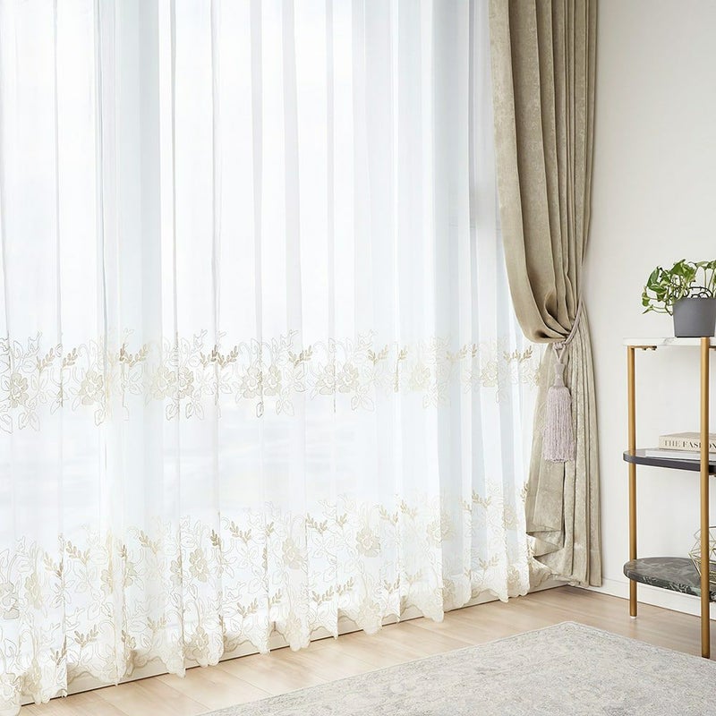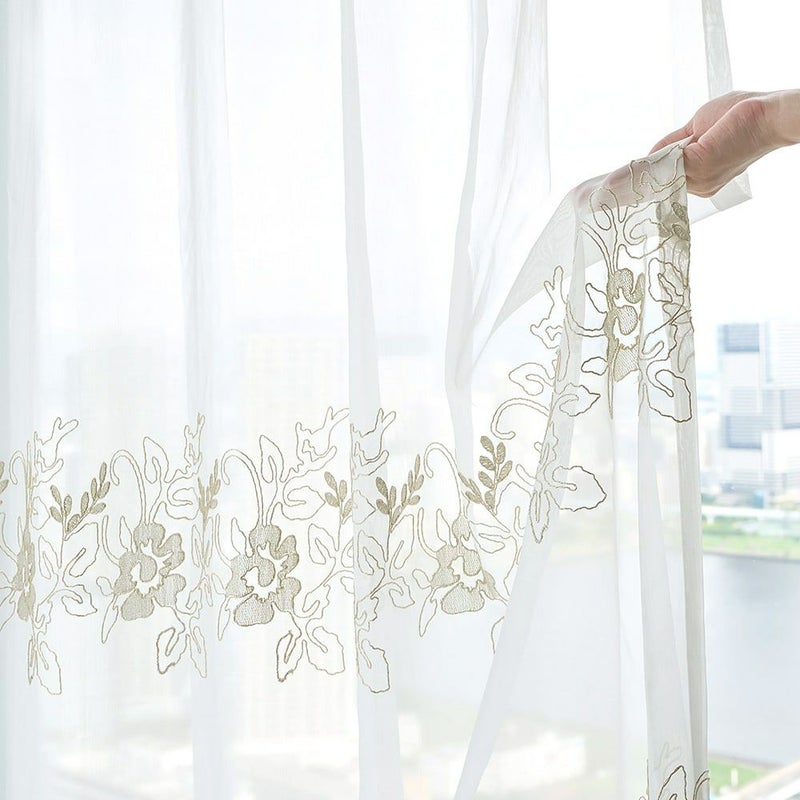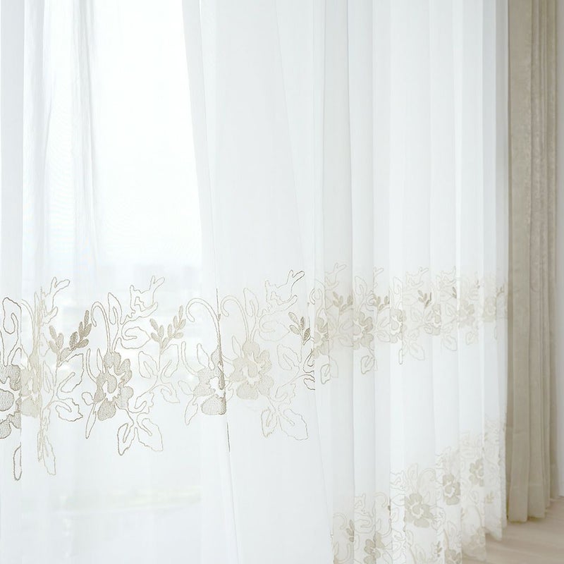 シャンパンゴールドの刺繍で施された贅沢な裾のスカラップ仕上げが、上品でエレガントな雰囲気を演出してくれます。お気に入りの窓辺にふさわしい、裾まで刺繍の魅力が表現されているレースカーテンです。