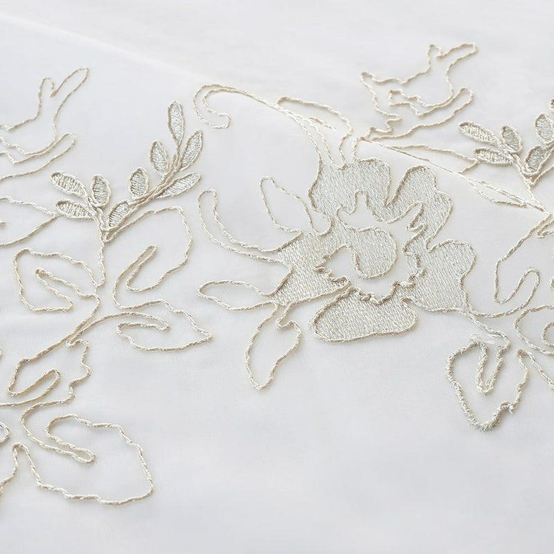 きめの細かい繊細なボイルレースに、立体的に施された刺繍デザイン。緻密なデザインと、ぷっくりと浮かび上がる刺繍の姿はいつまでも眺めていたいほど美しい。