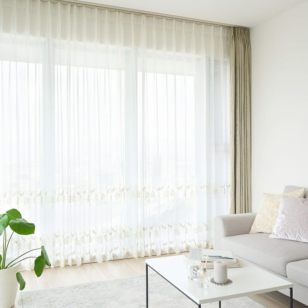 緻密かつ均等に施されたフラワーモチーフの刺繍は、遠目に見ると美しい直線を描き、まるで窓辺を彩るアクセサリーのよう。お部屋を上品で洗練された雰囲気に演出します。