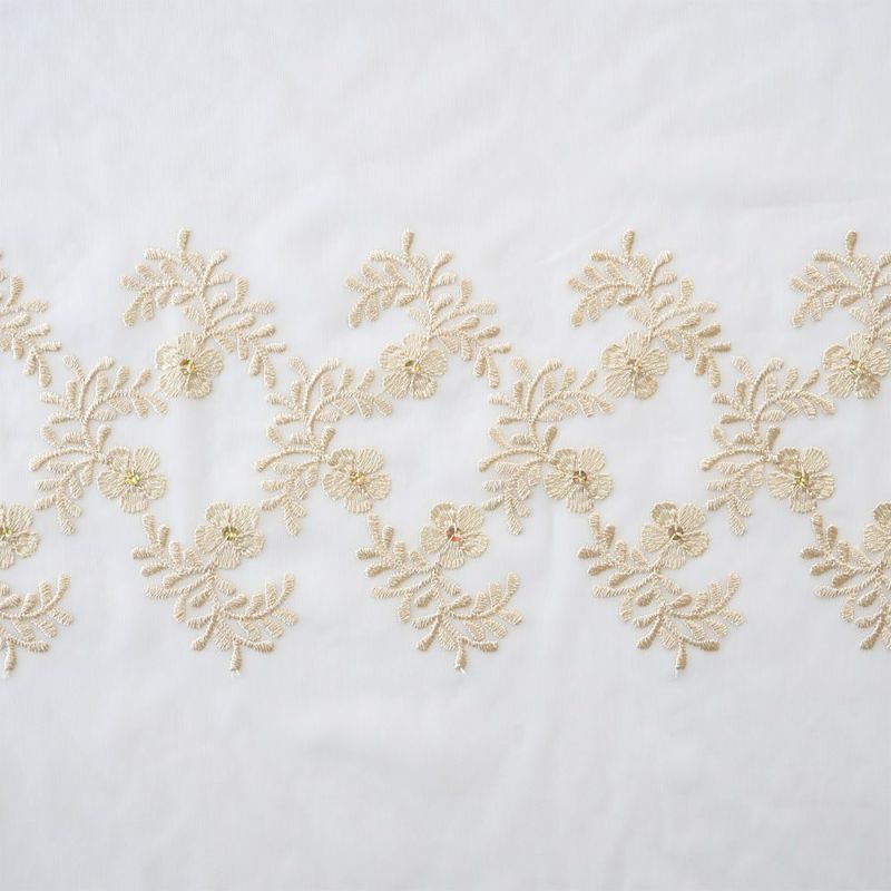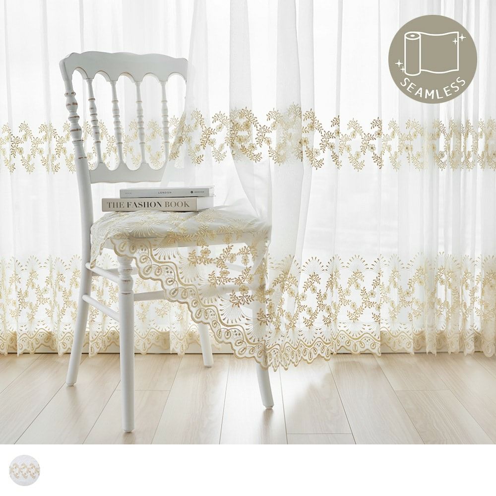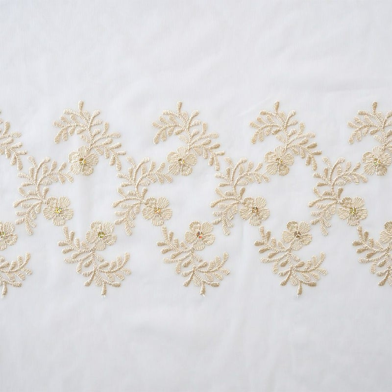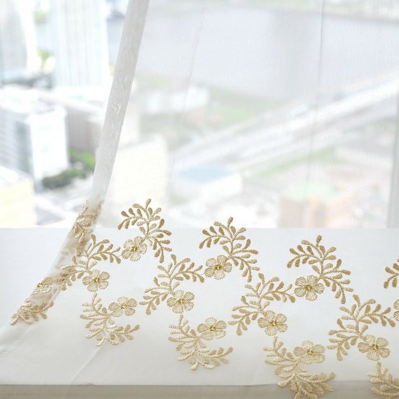 艶のあるシャンパンゴールドの刺繍で施された贅沢な裾のスカラップ仕上げが、上品でエレガントな雰囲気を演出してくれます。裾にさりげなく施された、スパンコールもポイント。お気に入りの窓辺にふさわしい、裾まで刺繍の魅力が表現されている1枚です。