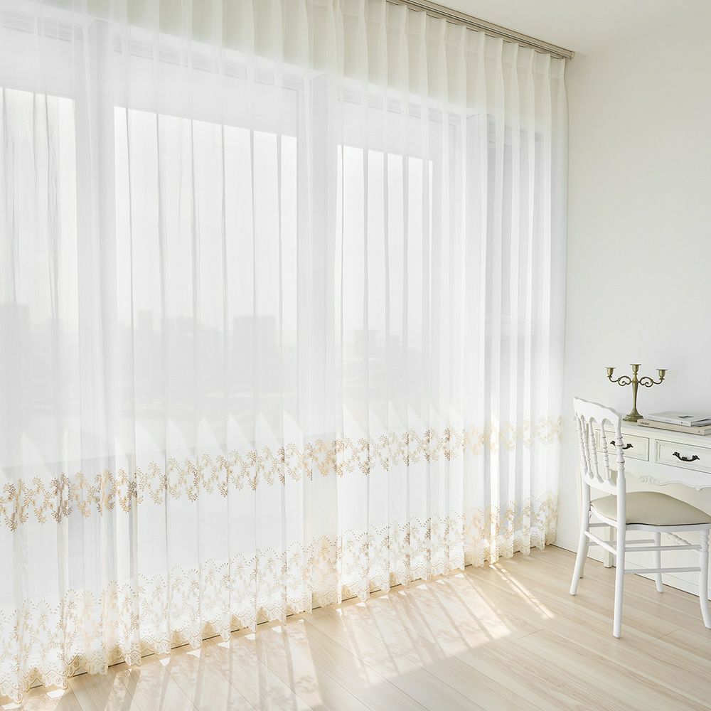 金糸やスパンコールを使用した、繊細なデザインの刺繍レースカーテン。ゴールド刺繍の魅力がぎゅっと詰め込まれた美しい直線的なラインが、お部屋を上品で洗練された雰囲気に演出します。更に光が差し込むと、繊細なレースが美しい影を作り出し、幻想的なシルエットを床に映し出します。そんな光によって生み出される幻想的なシルエットが、お部屋に上品な印象を与えてくれるでしょう。