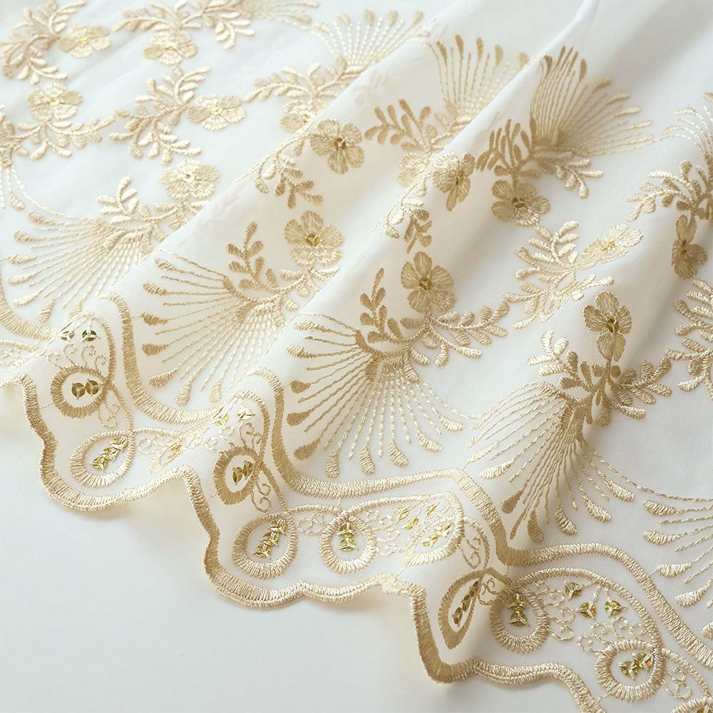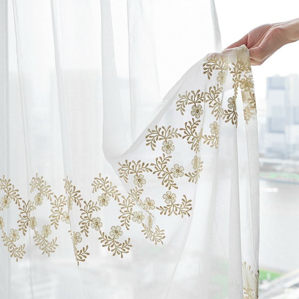 透け感のあるボイル地に施された、繊細なゴールドの刺繍。そのエレガントな刺繍がラインのように並ぶ姿は、思わずため息が出てしまうような美しさです。まるで窓辺を彩るアクセサリーのよう。そんな美しい刺繍レースが、日々の生活に優雅で特別な彩りを添えてくれます。