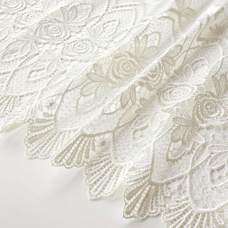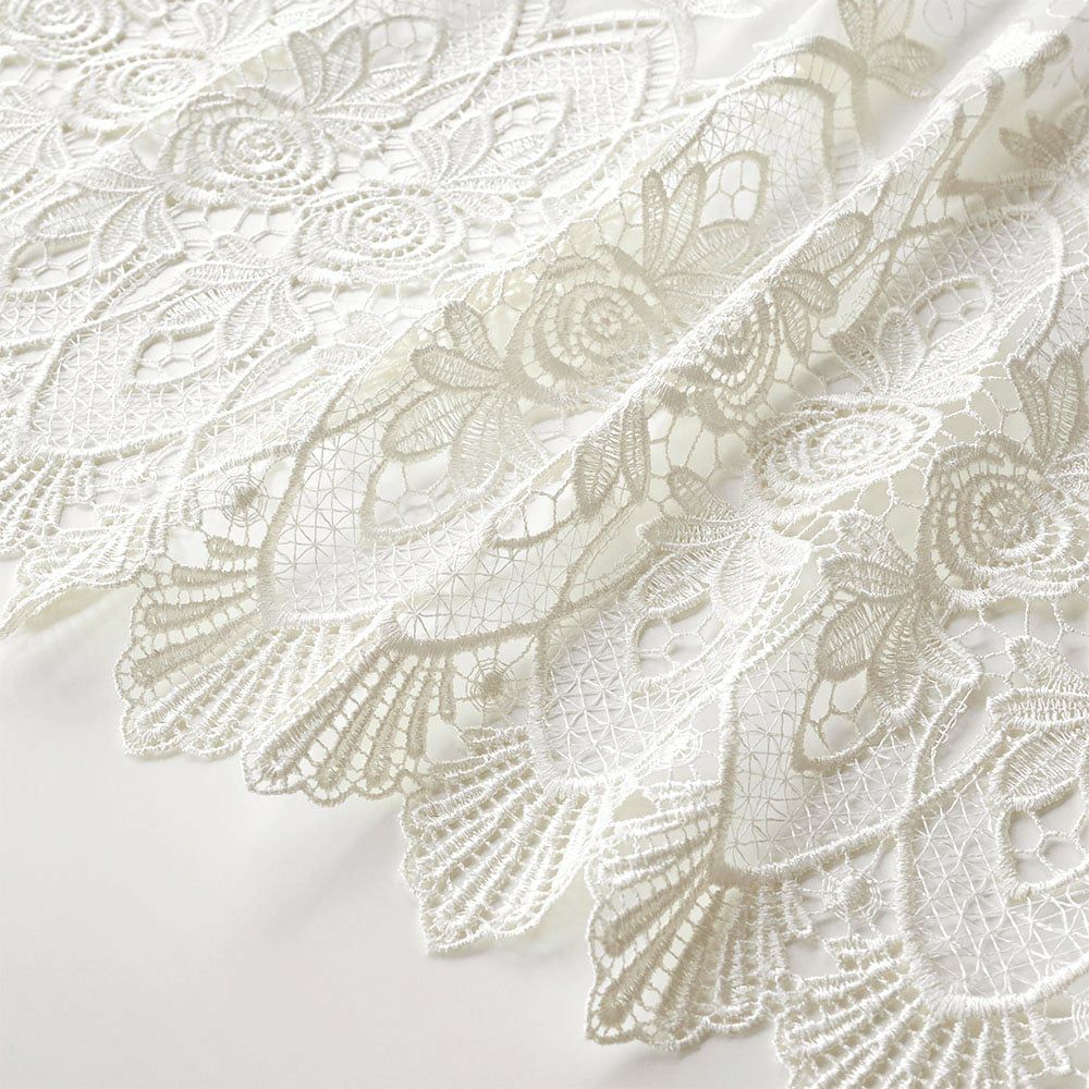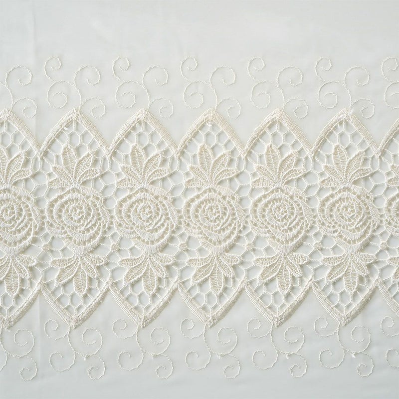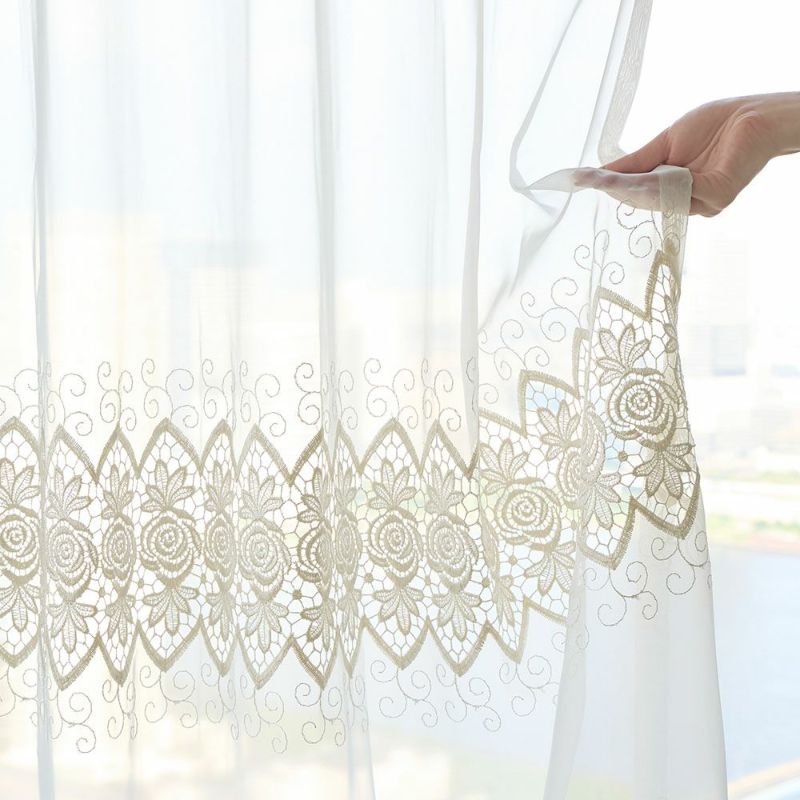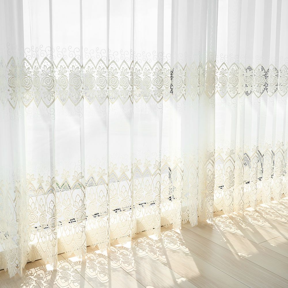 ベースは程よい透け感のあるボイル生地。だからこそ、差し込む日差しもふんわりと優しい印象になります。更に生地を切り抜いて作る透かし模様のカットワーク刺繍により、透けて見える外の景色とのコントラストも魅力です。ほのかに透ける外の景色と、柔らかい陽の光を存分にお楽しみください。