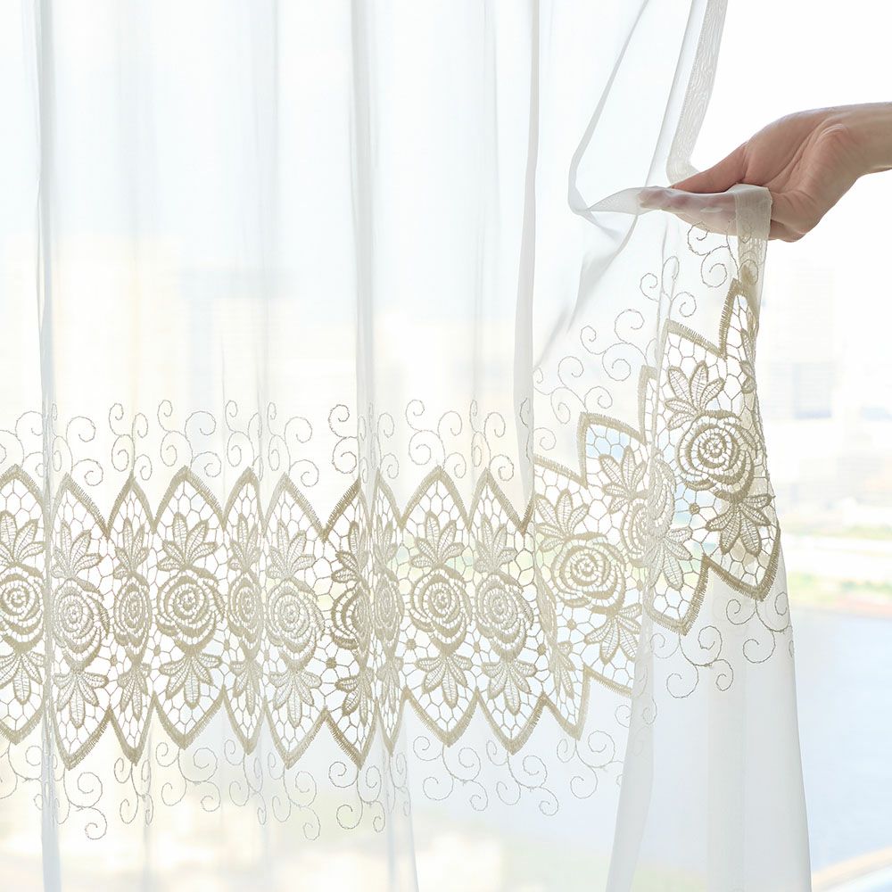 緻密かつ均等に施された繊細な薔薇の刺繍は、遠目に見ると美しい直線を描き、まるで窓辺を彩るアクセサリーのよう。お部屋をエレガントに演出する刺繍に思わずうっとり。
