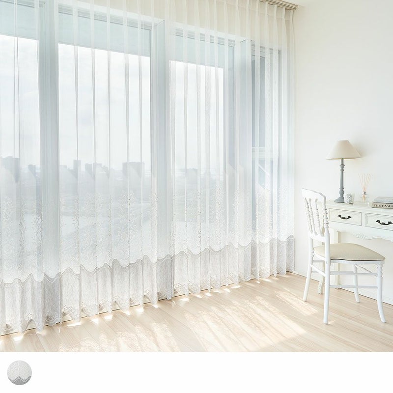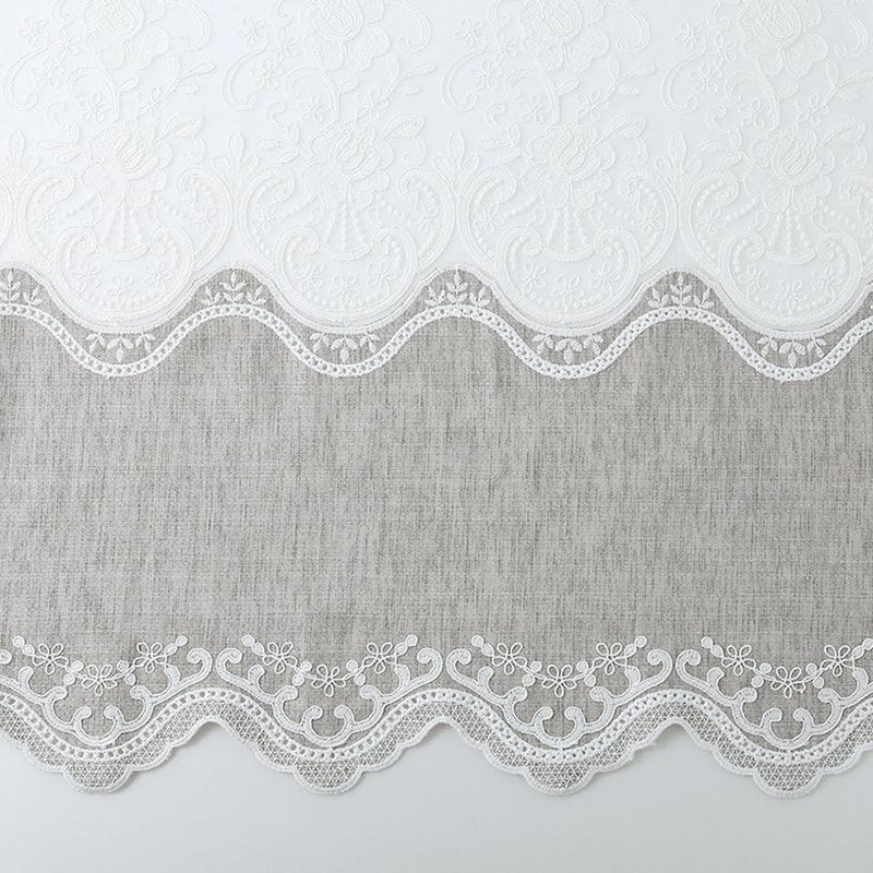 刺繍レースカーテンには珍しい、切り替え風のデザインが目を惹くレースカーテン。トルコ産の美しい軽やかなボイル地をベースに、裾部分にはカジュアルな印象のテキスタイルを。異なる生地感を1度に楽しめる、贅沢なレースカーテンです。