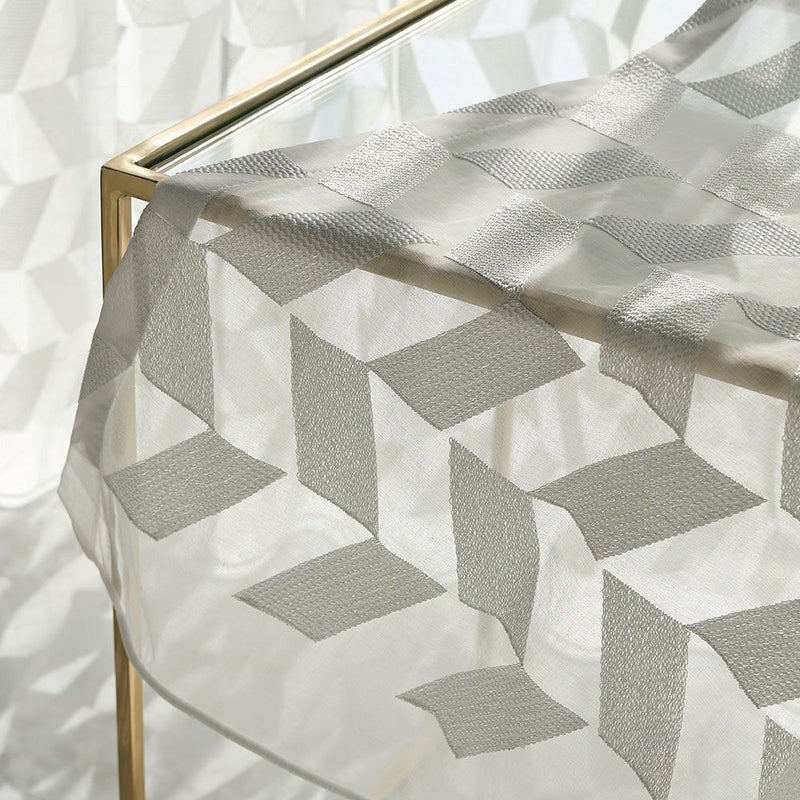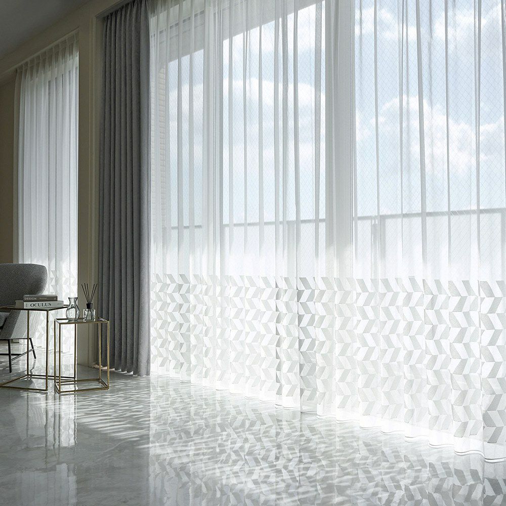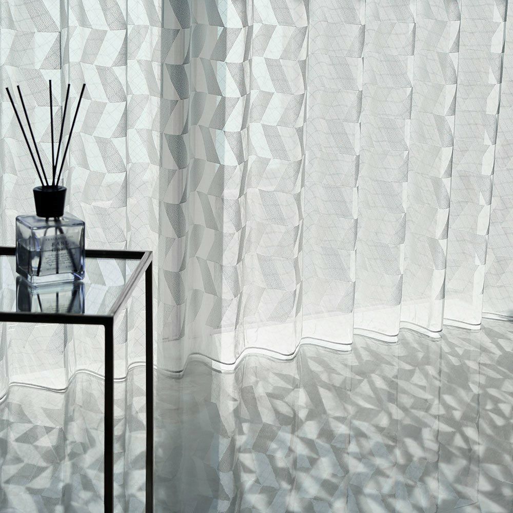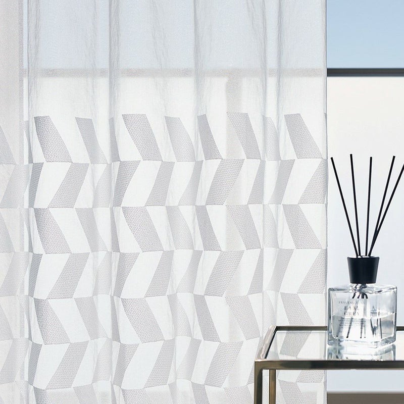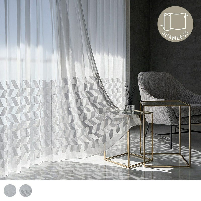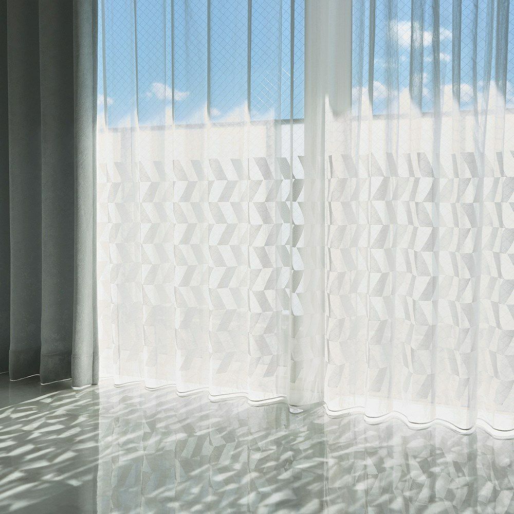 クリアな質感と美しい透明感、かといって透けすぎない絶妙な厚みのレースカーテン。幾何学刺繍が施された部分とベース地部分、2つの透け感の差が生み出す立体感が、窓辺に品格を添えます。