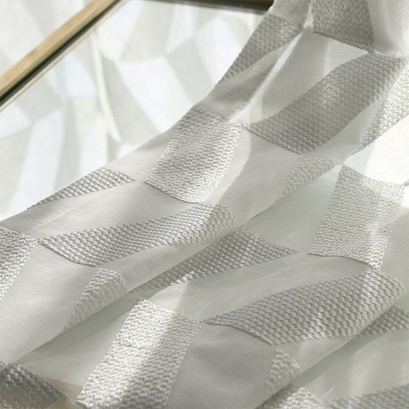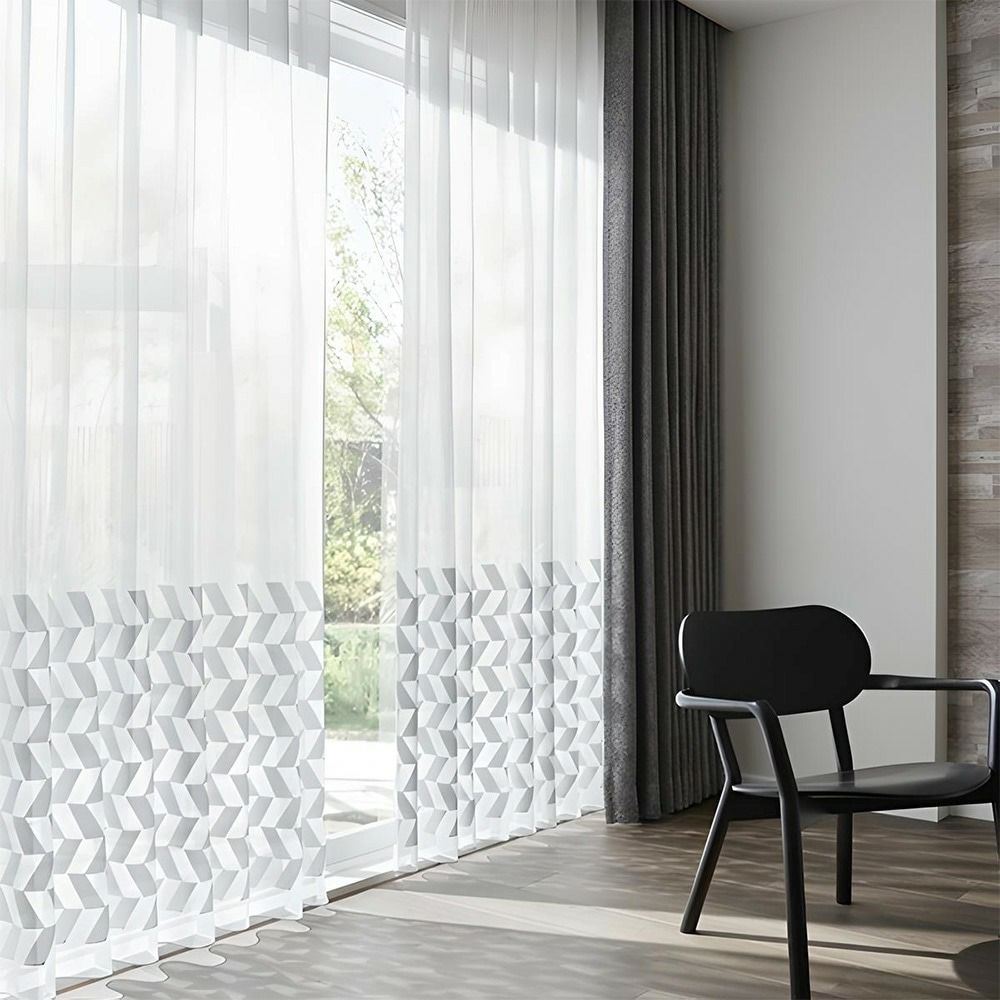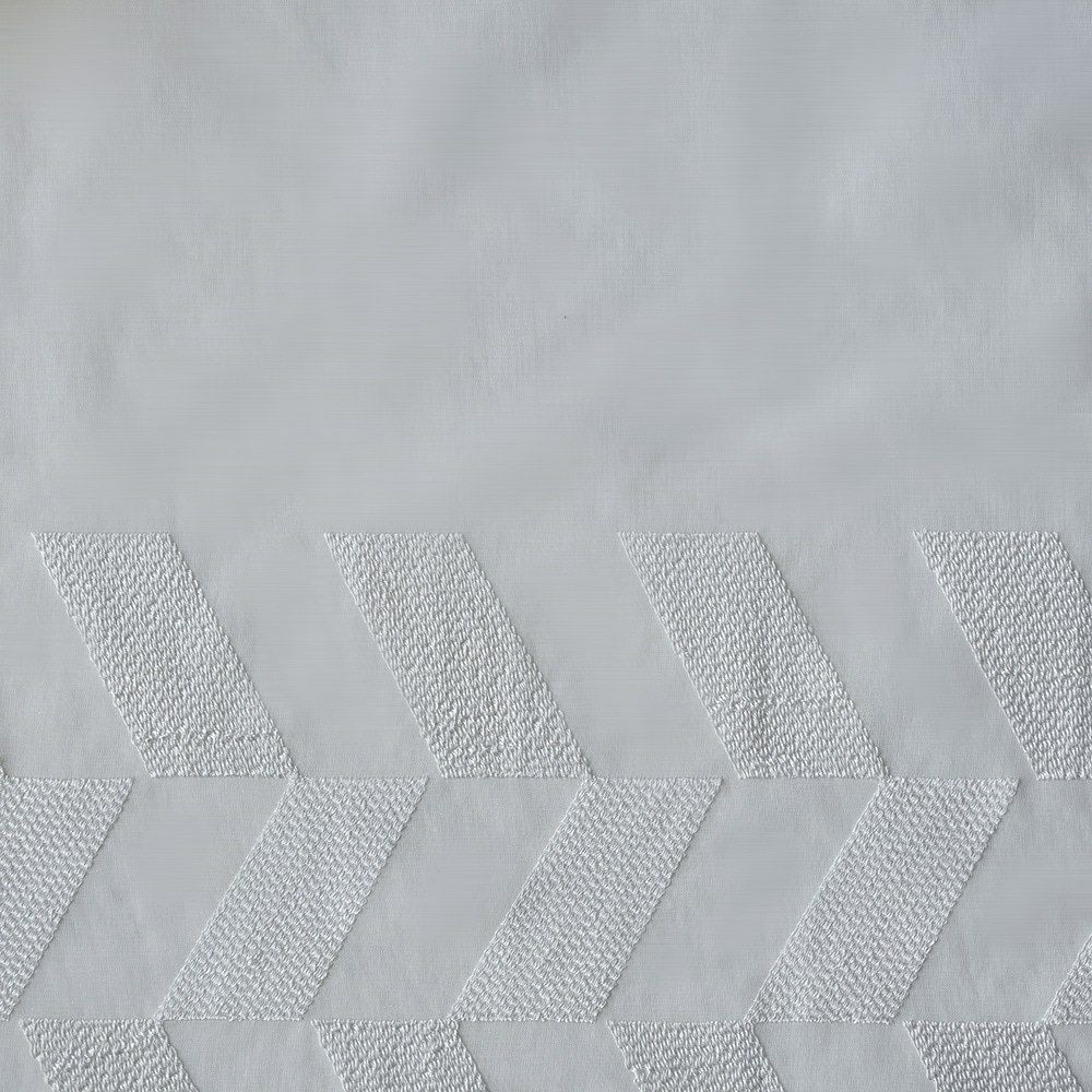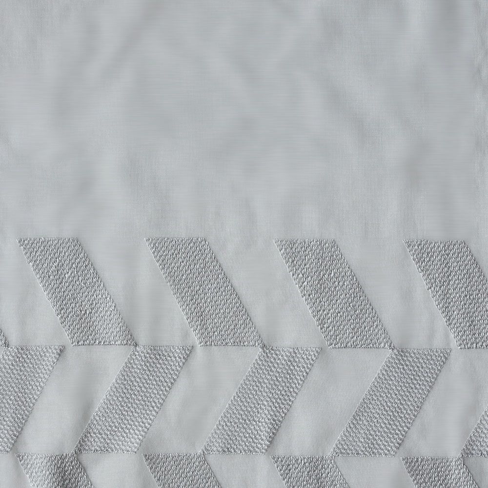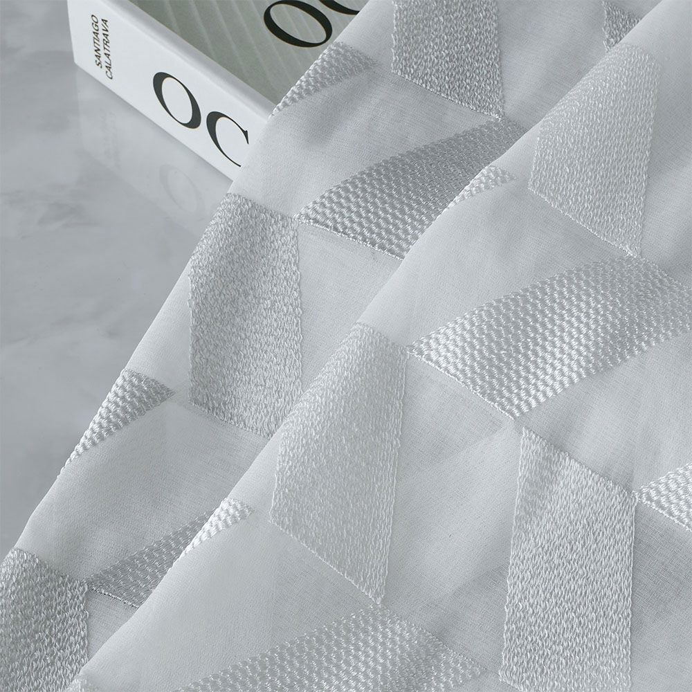クリアな質感と美しい透明感、かといって透けすぎない絶妙な厚みのレースカーテン。幾何学刺繍が施された部分とベース地部分、2つの透け感の差が生み出す立体感が、窓辺に品格を添えます。