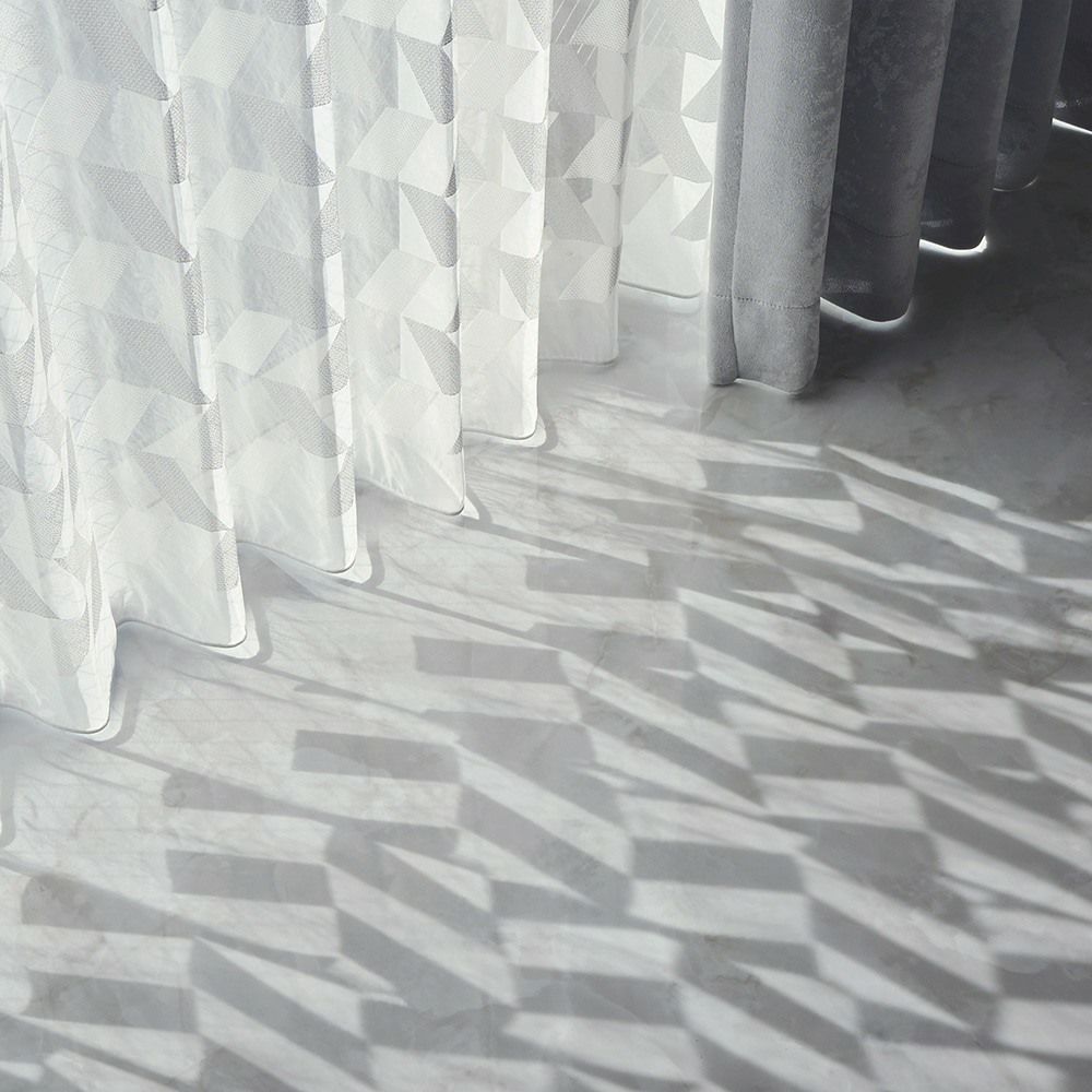 降り注ぐ光の角度が変わったり、レースカーテンが揺れることによって、床に映し出されるシルエットも揺らぎます。光と影の変化で、一瞬一瞬の移ろいを感じさせ、見るものの心を魅了するテキスタイルです。