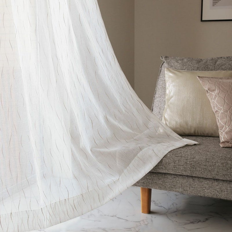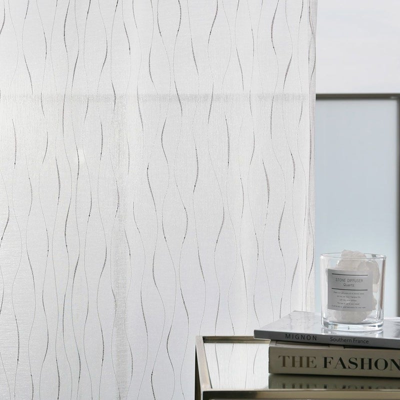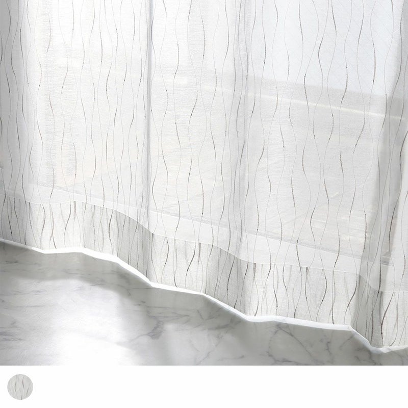 そよそよと風に揺られるレースカーテンの姿は、くつろぎのひと時に相応しい。そして、風に揺られるよろけストライプのデザインが、まさに舞い落ちる木の葉のようで私たちの心を魅了します。