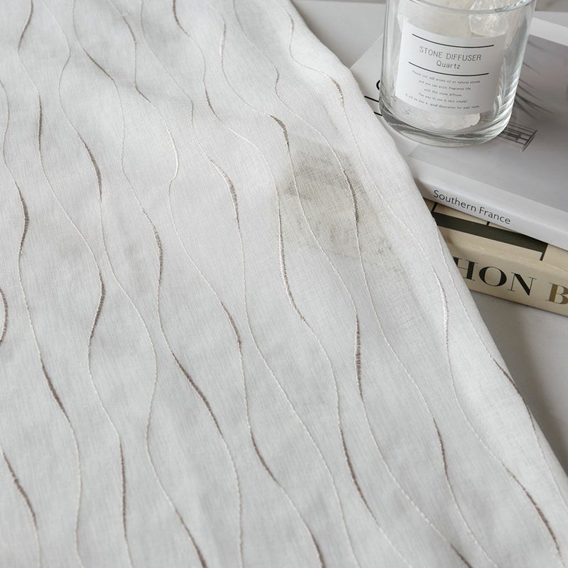 麻ライクのベース生地に、まるで舞い落ちる木の葉のような「よろけストライプ」の刺繍を施したデザインレースカーテン「フリッカー」。繊細で可憐なストライプ刺繍は、光と溶け合い調和します。モダンかつ柔らかい印象を与えてくれる、上質な窓辺に。