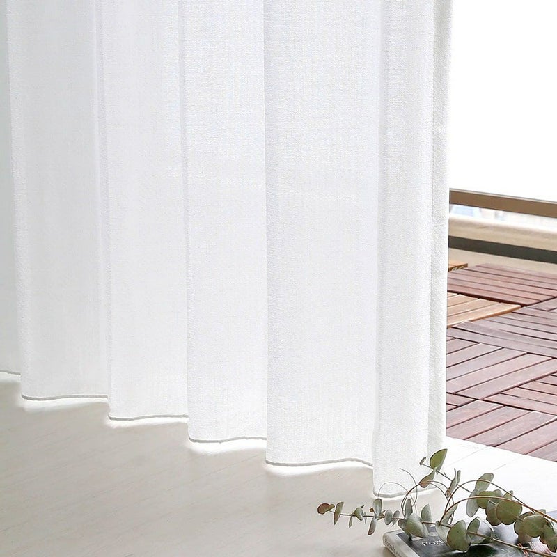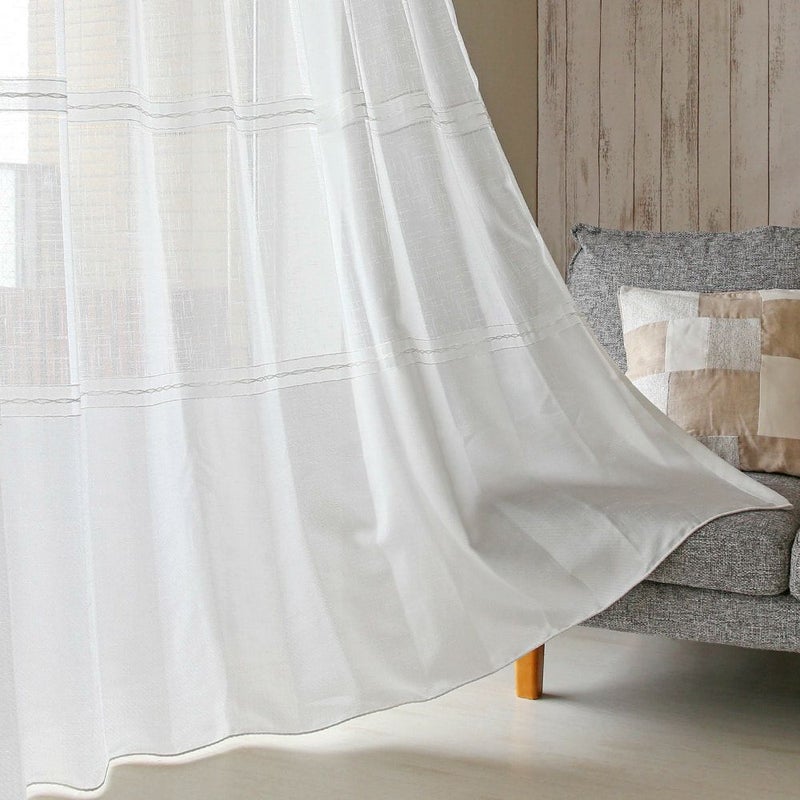 レースカーテン上部には、ガーゼの様なふんわりとした風合いのボイル生地。レース下部には光沢感のあるやや厚手の生地。そしてふたつの生地をつなぐのは、繊細なウェーブラインが施されたおしゃれなデザイン。見るたびにほれぼれとしてしまう、ディレクターイチ押しのデザインです。