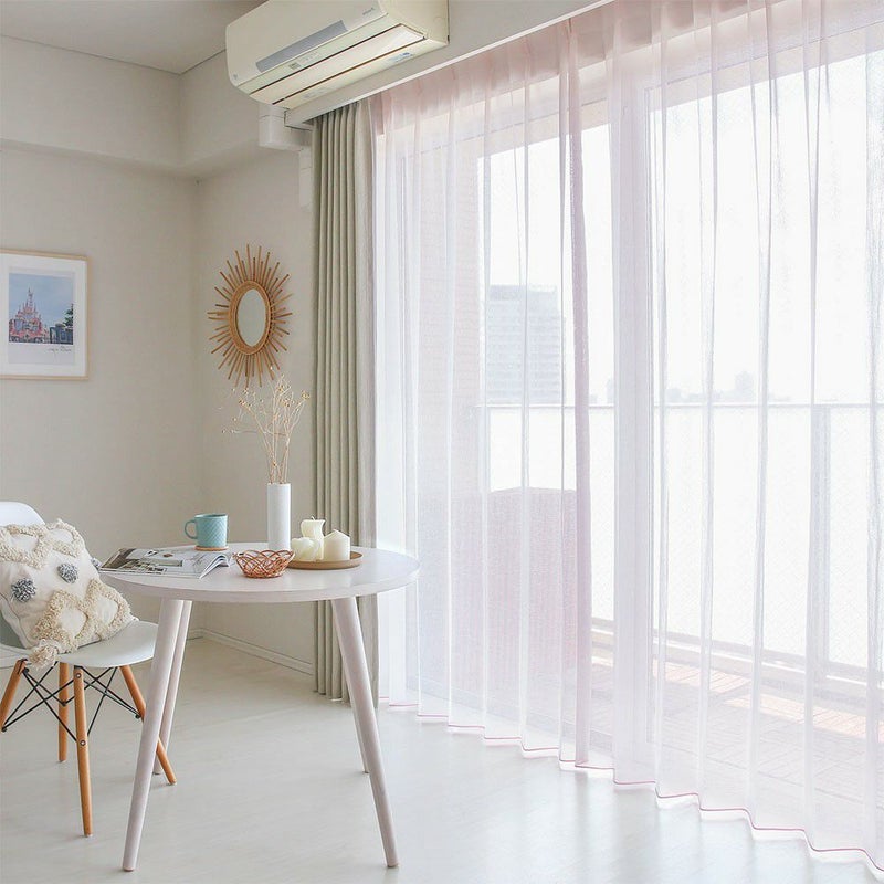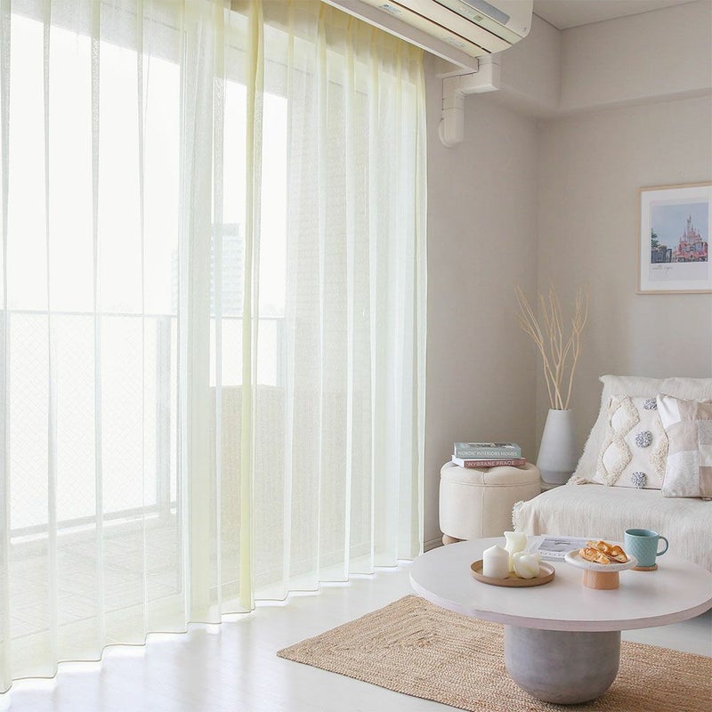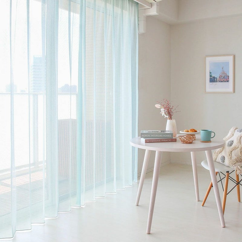 シンプルな家具でまとめられた、ナチュラルな空間。そこに、優しいトーンのカラーレースカーテンをかければ、それだけでトレンド感のある愛され部屋に。