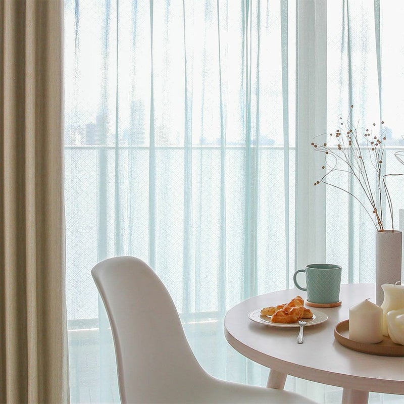 レースカーテンらしい透け感と、そこから差し込む優しい陽ざしを楽しむ。それは、ボイルレースカーテンならではの魅力です。柔らかな陽ざしを感じられる窓辺で、心ときめくティータイムを。