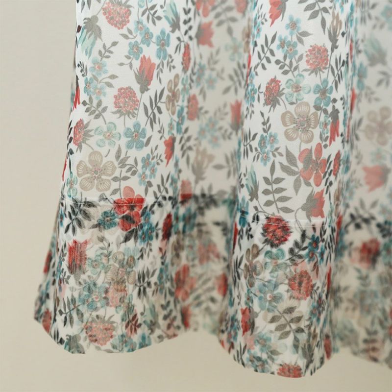 眺めているだけで、楽しい気持ちがふつふつと湧いてくるような。そんな、愛らしい空間に相応しいレースカーテンです。華やかな印象のリバティプリントと繊細なオーガンジー生地を、ぜひご自宅の窓辺でご堪能ください。