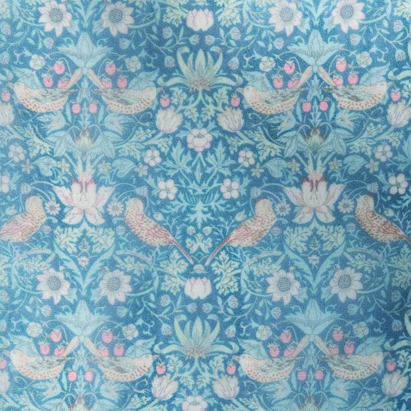 世界中の人々から愛されているリバティプリント。その中でも人気の高い、ウィリアムモリスのいちご泥棒を、オーガンジー生地に繊細なタッチで落とし込みました。幻想的なブルーの色合いと、伝統的ないちご泥棒のデザインに心躍ります。華やかなリバティプリントと、繊細なオーガンジーのテクスチャーが織りなす美しい窓辺を、ぜひお部屋でお楽しみください。
