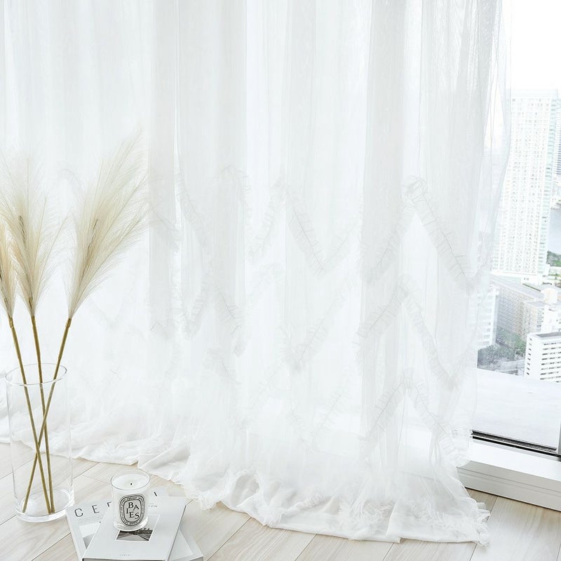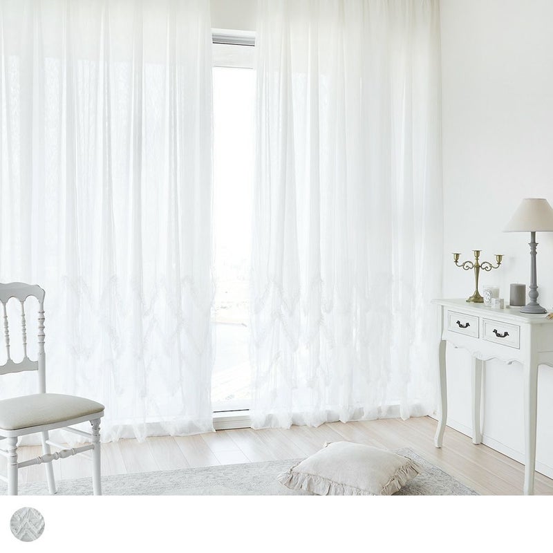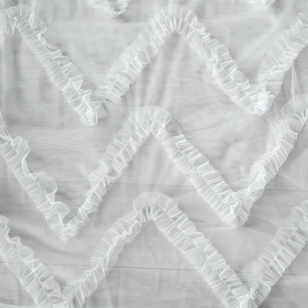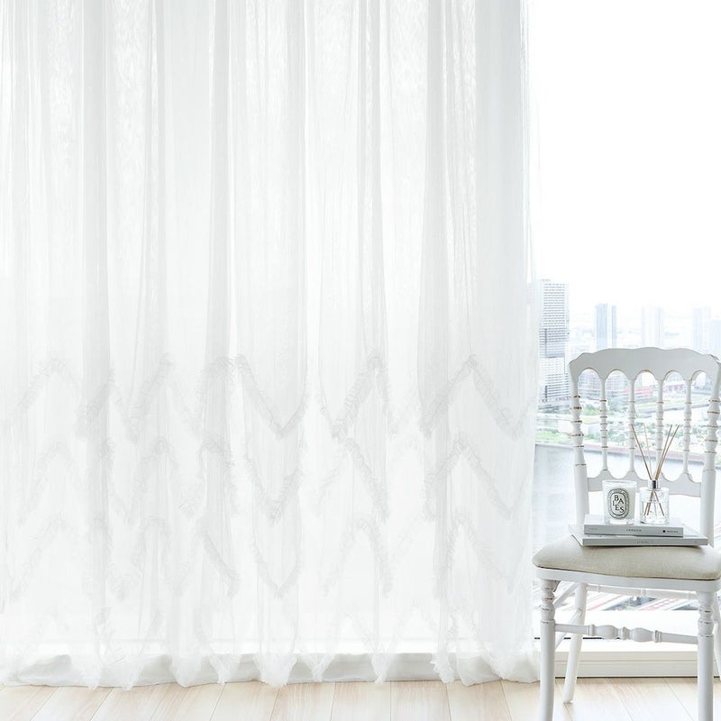 連なるV字ラインのように施されたチュールフリルがベース生地に対して4重に重なり、雪の結晶を彷彿とさせるデザインを生み出します。チュールフリルが1枚ずつ、異なる高さで重なることによって生まれるクラシカルなデザインを、ぜひご自宅の窓辺に。