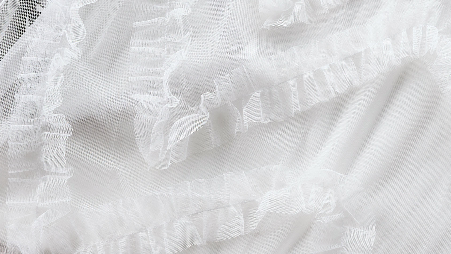 雪の結晶を連想させるチュールフリルが印象的なデザインレースカーテン「スノーフレークフリル」。その品格ある佇まいは、まるで可憐なウエディングドレスのよう。4重にも重なったチュール生地が、クラシカルで女性らしいシルエットを演出します。あなたの窓辺に、プレミアムなデザインレースカーテンを。