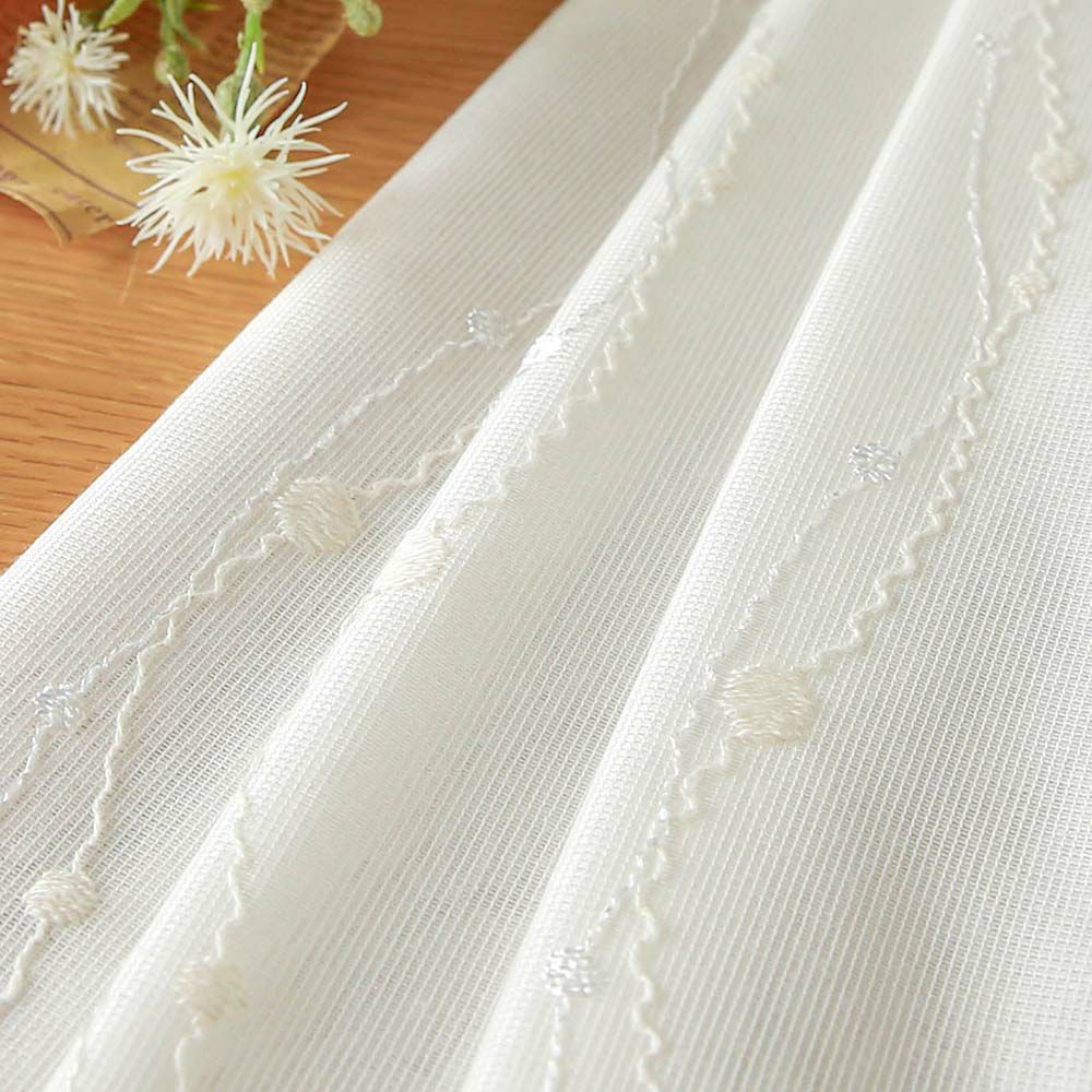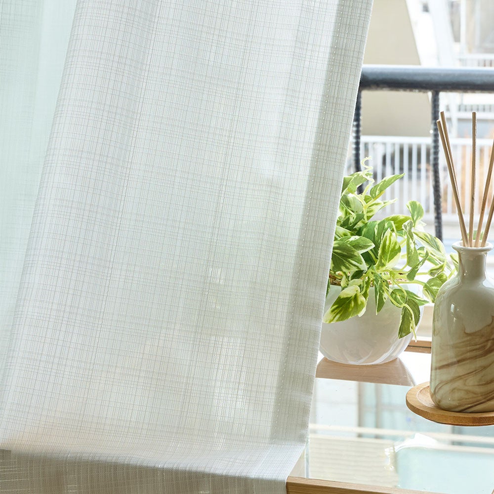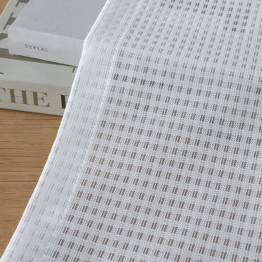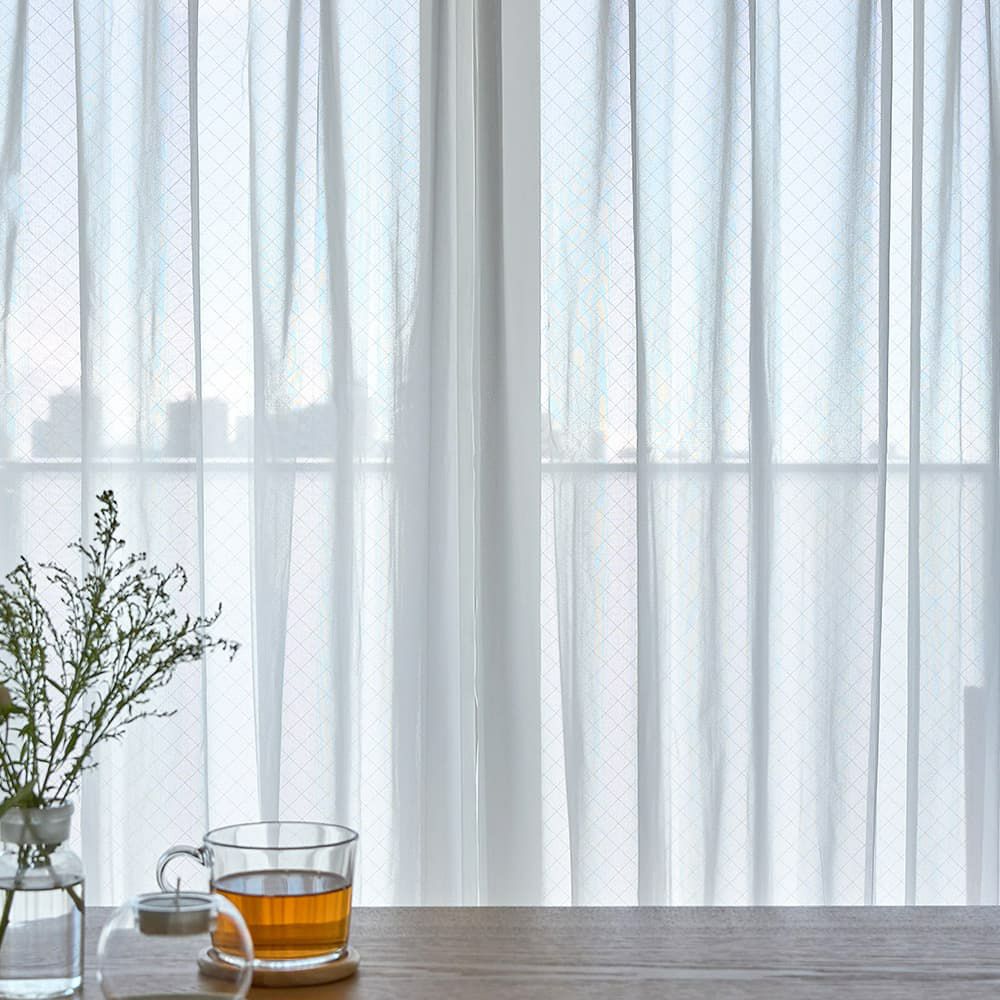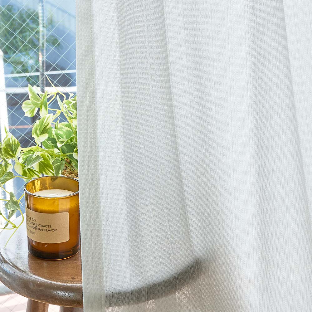 昼間室外から室内を見えにくくするレースカーテンですが、その秘密は裏面に編み込まれたブライト糸と呼ばれる反射する糸にあります。 この糸は、太陽光を反射することで、まるで鏡のようにプライバシーを守ってくれます。外部からの明るさを利用して透けにくさを作り出すため、夜間の遮像効果は期待できません。しかし、遮像レースカーテンのように目を密にせずともブライト糸の分量によって透けにくさを調整できるため、 室内側からは程よい透け感があり、景観を楽しめるだけでなく、「見える安心」も手に入る優れものです。