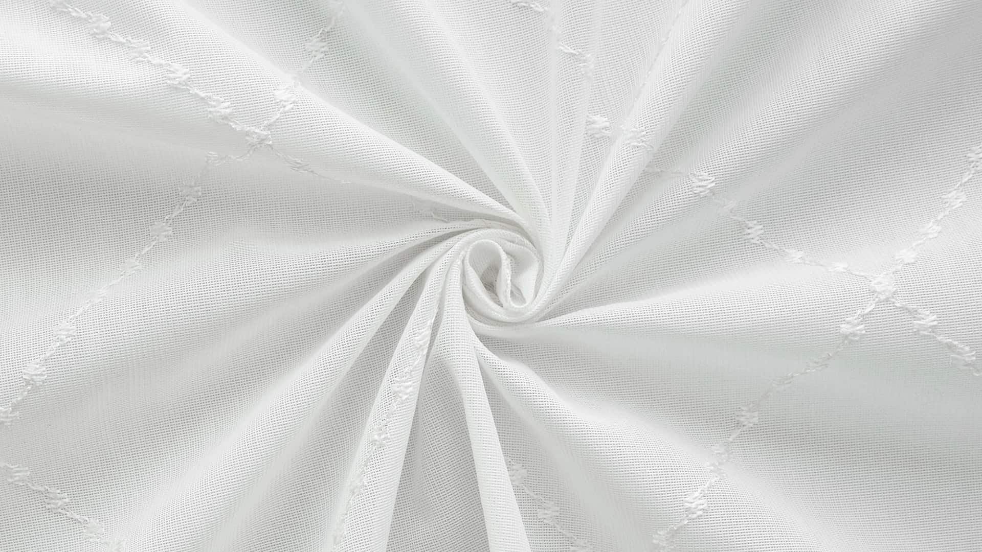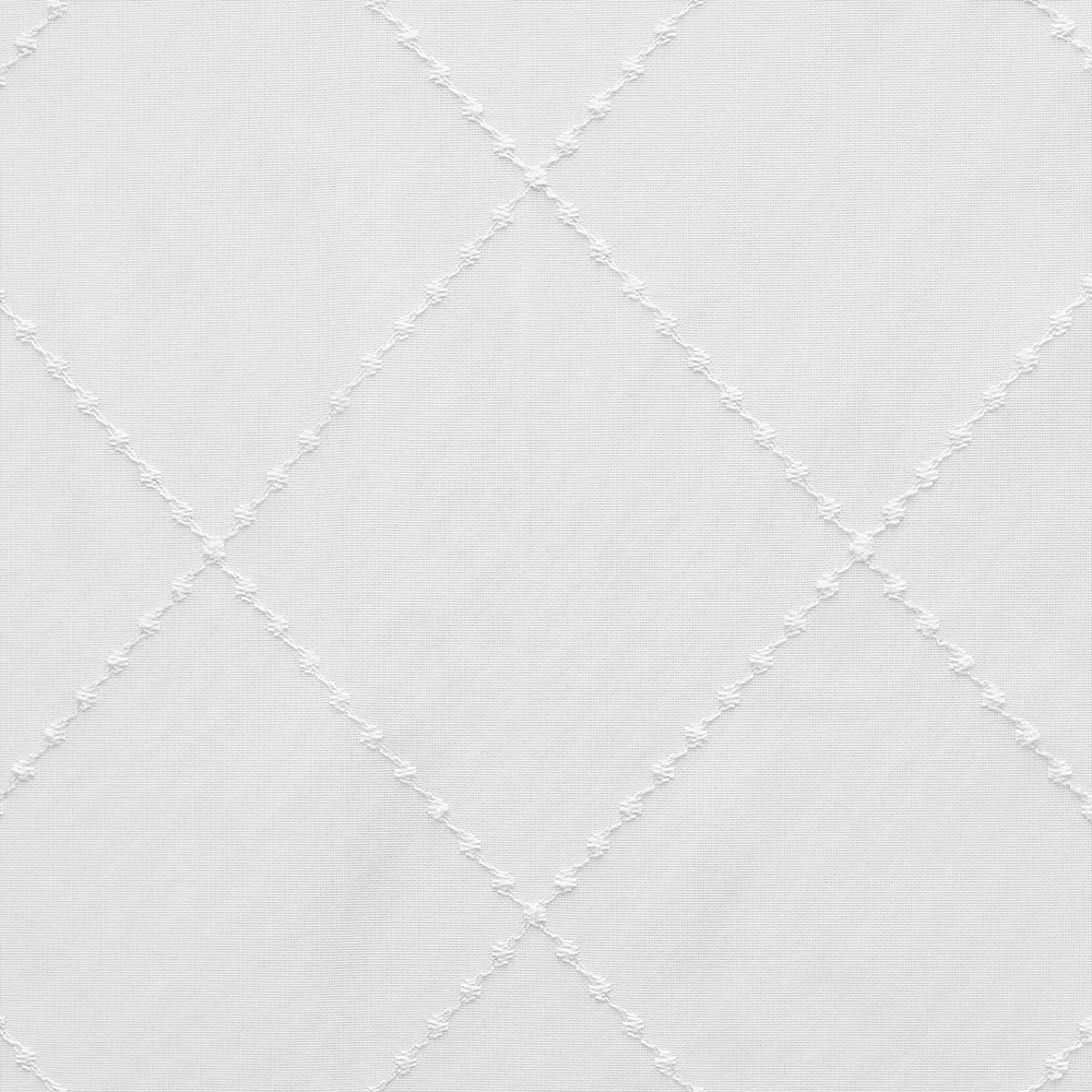 透け感のあるベース生地に、細やかなダイヤ柄刺繍をあしらいました。柄が前に出すぎないため、家具や床材、カーテンボックスとも自然に調和します。「何もないと物足りない、でも柄は強すぎたくない」そんな窓辺にちょうどいい一枚です。