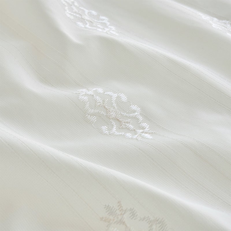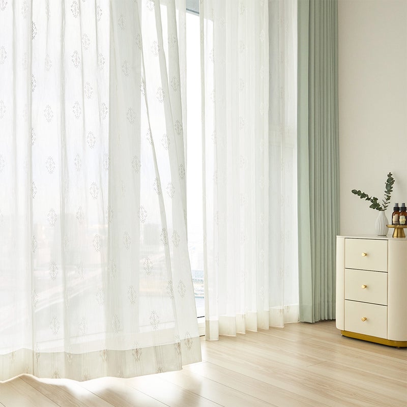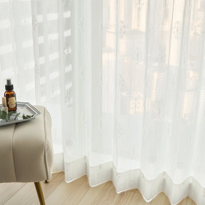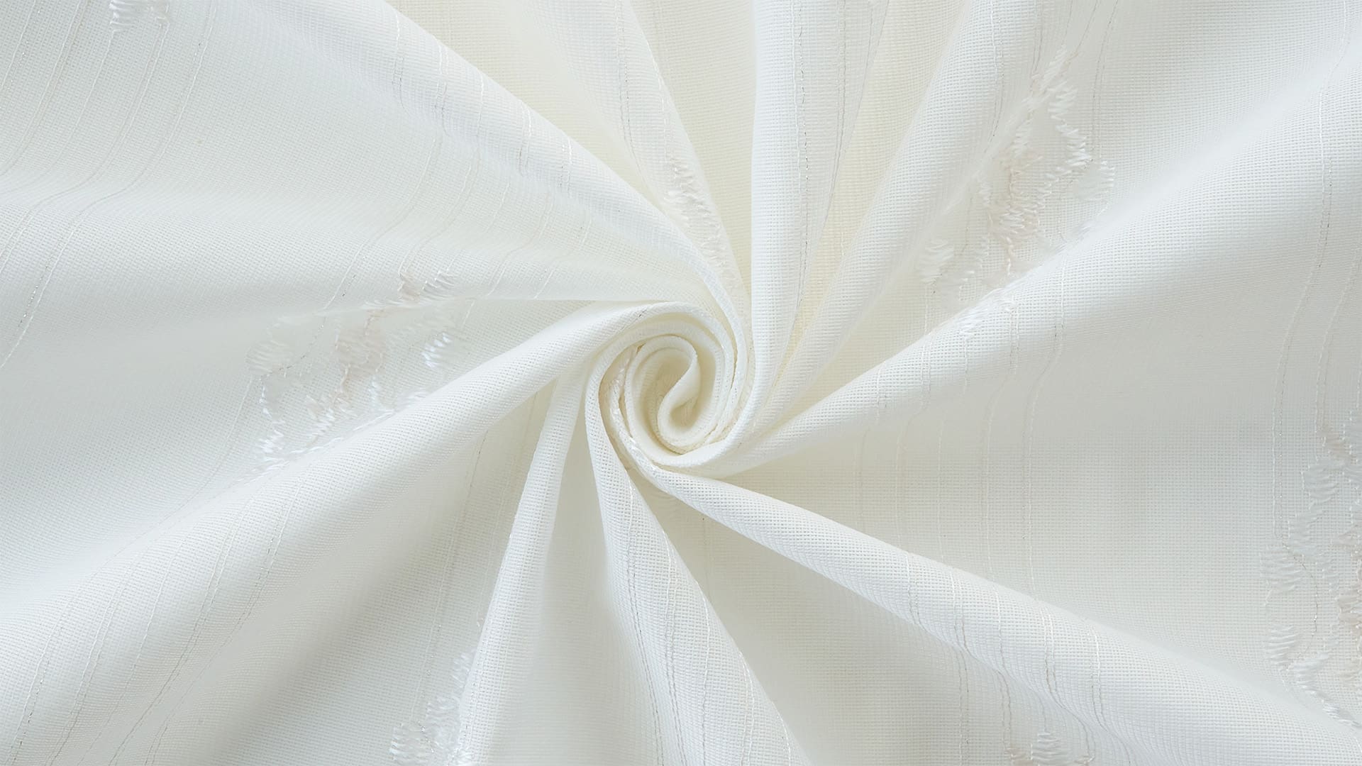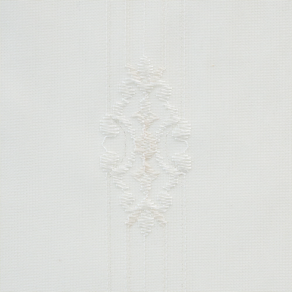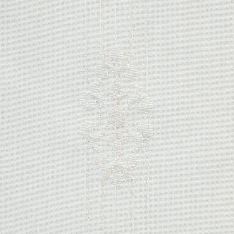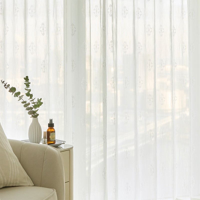 ストライプ状にあしらわれた繊細なオーナメント柄が、窓辺にすっとした縦の流れを生み、空間をすっきりと美しく見せてくれます。 細やかな装飾でありながら、白を基調とした、軽やかな表情が魅力。圧迫感がなく、自然光と溶け合うような上品さが、日常の風景に静かな華やぎを添えます。