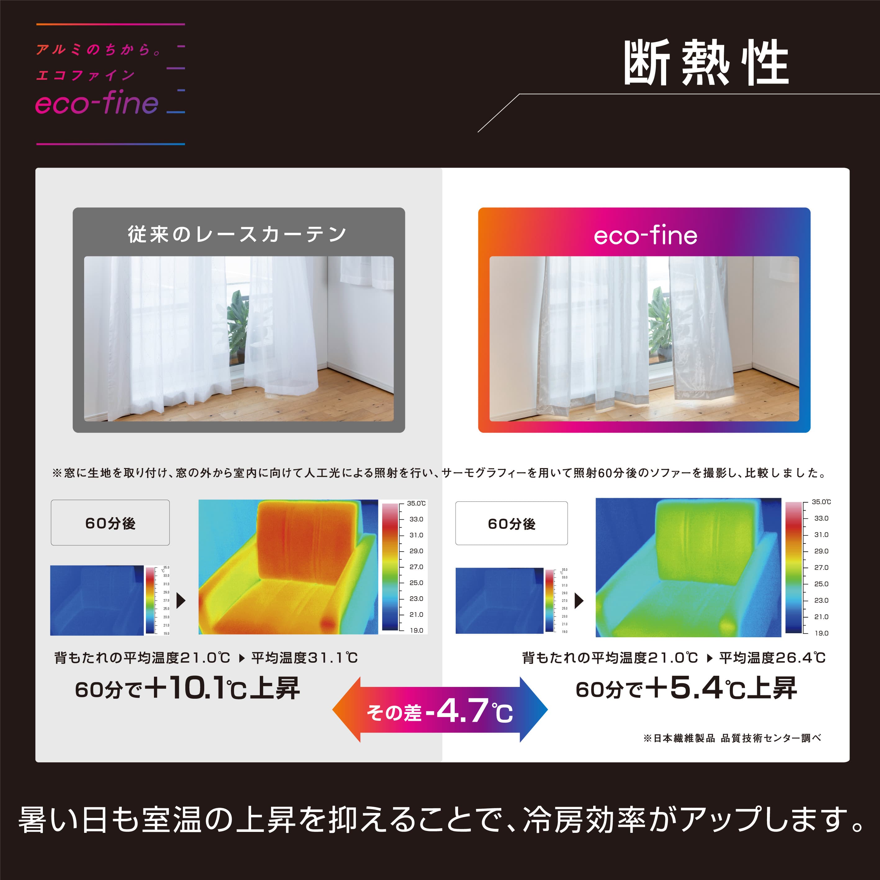 エコファインはなんと【遮熱 効果45%以上】!これは通常のレースカーテンをつけた場合と比較すると、約4倍(※当社調べ)の遮熱力です。 サーモグラフィの画像でみると、その差は一目瞭然。アルミ蒸着フィルムの反射効果が叶える驚きの 遮熱 効果で、夏の厳しい暑さから、お部屋を守ってくれます。
