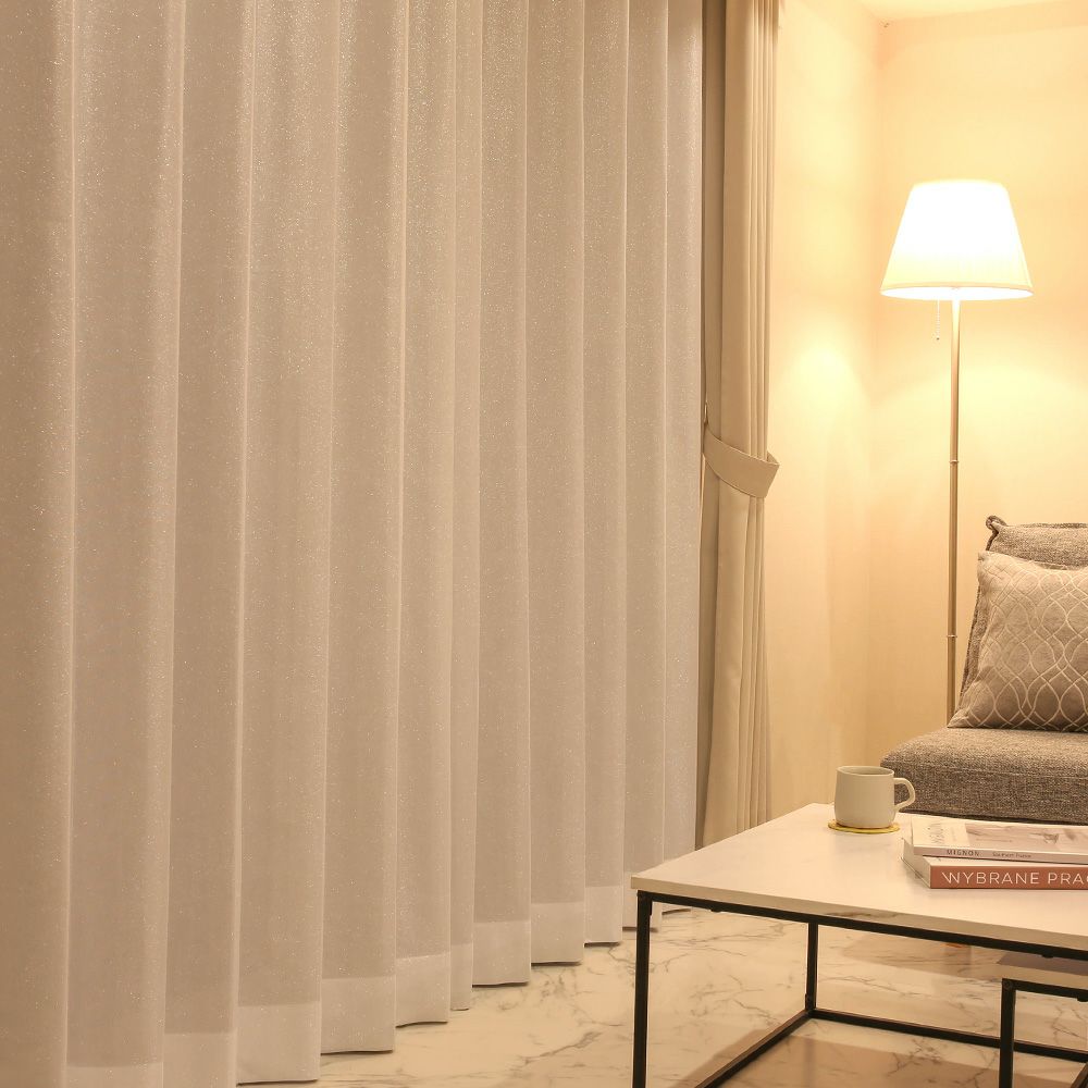 シンプルな手触りのレースカーテンに施された、繊細なラメ。レースカーテンを触れると、指先からもラメを感じて、毎日の開け閉めが楽しい瞬間に。
