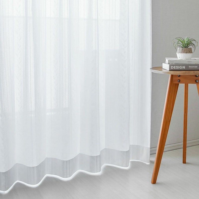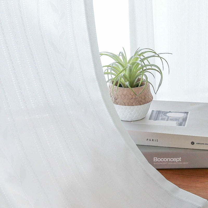 ストライプ状に入ったラインとリーフ柄がお洒落なレースカーテン。光があたると、ベース生地がさりげなく輝いてリーフ柄の魅力を引き立たたせます。