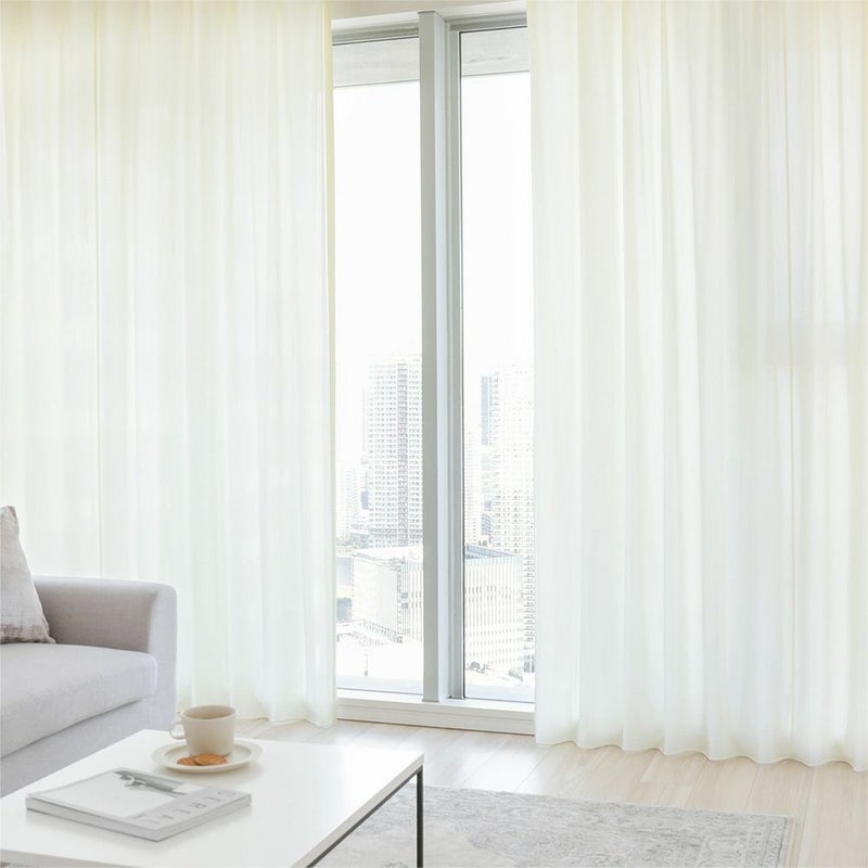 【撮影コーディネート】レースカーテン:<コモン ホワイト>光に満ちた明るいリビングを叶えたい方は、繊細なレースカーテンの上に「ミリュー」をコーディネートするのがおすすめ。遮像効果がしっかり備わっているので、レースカーテンのみでも昼夜問わず透けにくくプライバシーを守れます。繊細なボイルレースカーテンの上にミリューを組み合わせれば、開放感溢れる明るい空間に。