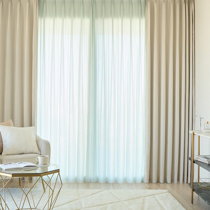 【撮影コーディネート】ドレープカーテン :<ティンクル ベージュ>昼も夜も透けにくい遮像レースカーテン。そんな遮像レースカーテンの中でも、圧倒的な透けにくさを誇ります。ドレープカーテンを開けた開放的なリビングでも、安心してプライベートタイムをお過ごしいただけます。