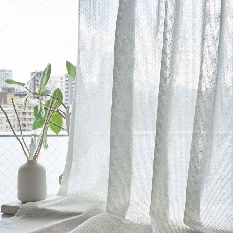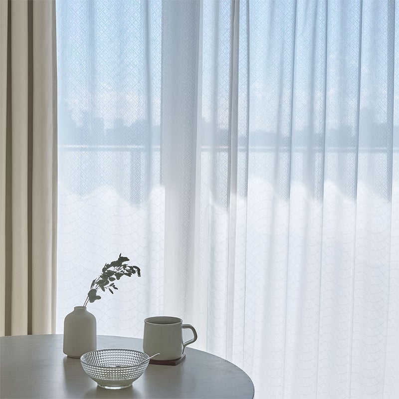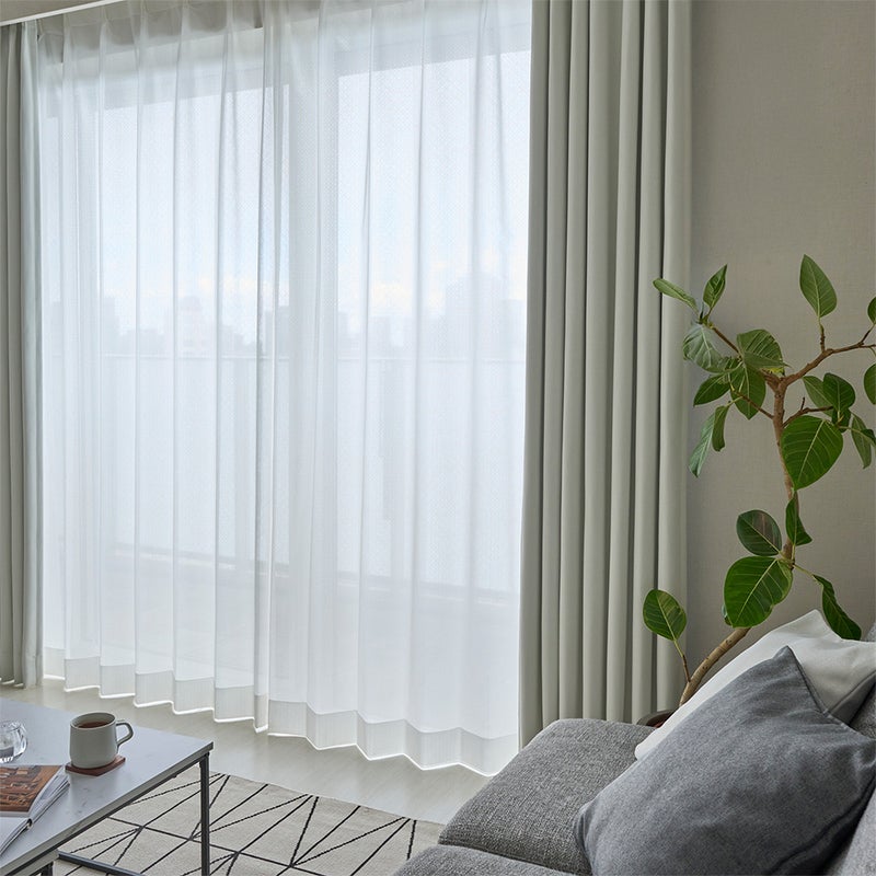 ぱっとみると無地のようでありながら、編みで表現されたダイヤ模様がおしゃれなデザイン。主張しすぎないさり気ない柄なので、どんなドレープカーテンにも組み合わせやすいのが嬉しい!