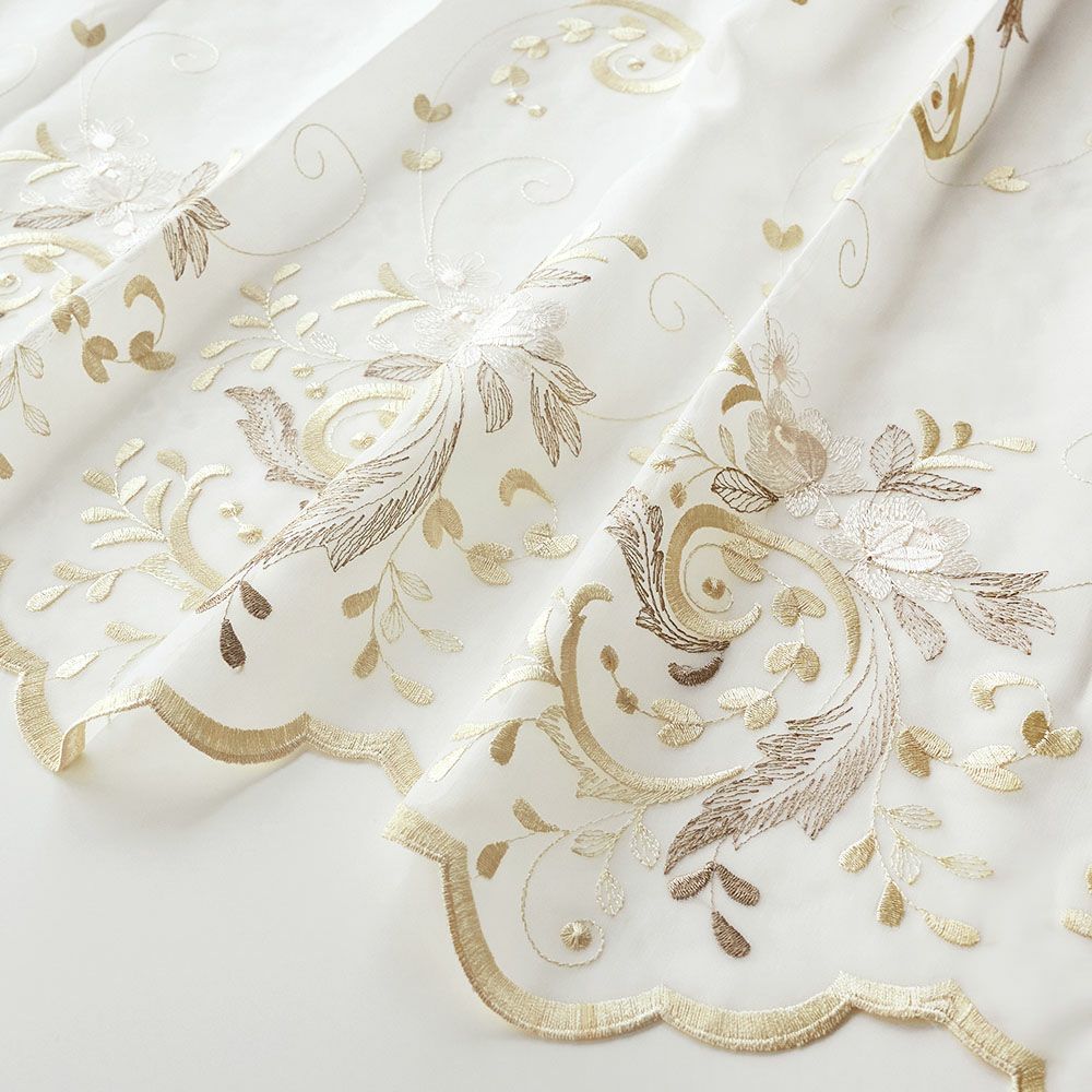 アンティークな印象のスカラップが華やかでエレガントな刺繍レースカーテン。光が差し込むと美しいチュールは、繊細な柄を浮かび上がらせ可憐なおしゃれを演出します。トルコ刺繍等、緻密なデザインの刺繍はクラシックな雰囲気のコーディネートにも。