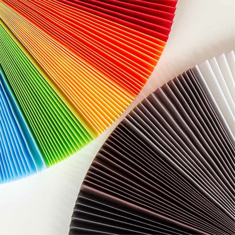 右上からホワイト、グレー、ブラウン、ブラックナチュラルなカラーから、差し色となるアクセントカラーまで、和洋室に合わせやすい全9色展開。畳んで濃く見える色も、光を通すと柔らかい印象に変わります。