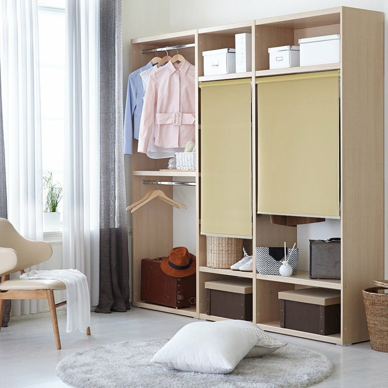 つっぱりロールスクリーンも1cm刻みのオーダー注文が出来るので、隠したいちょっとしたスペースにも、欲しいサイズで対応可能。つっぱりロールスクリーンならドアがない棚やクローゼットなど、急な来客時だけの用途としても簡単に取り付け出来ます。