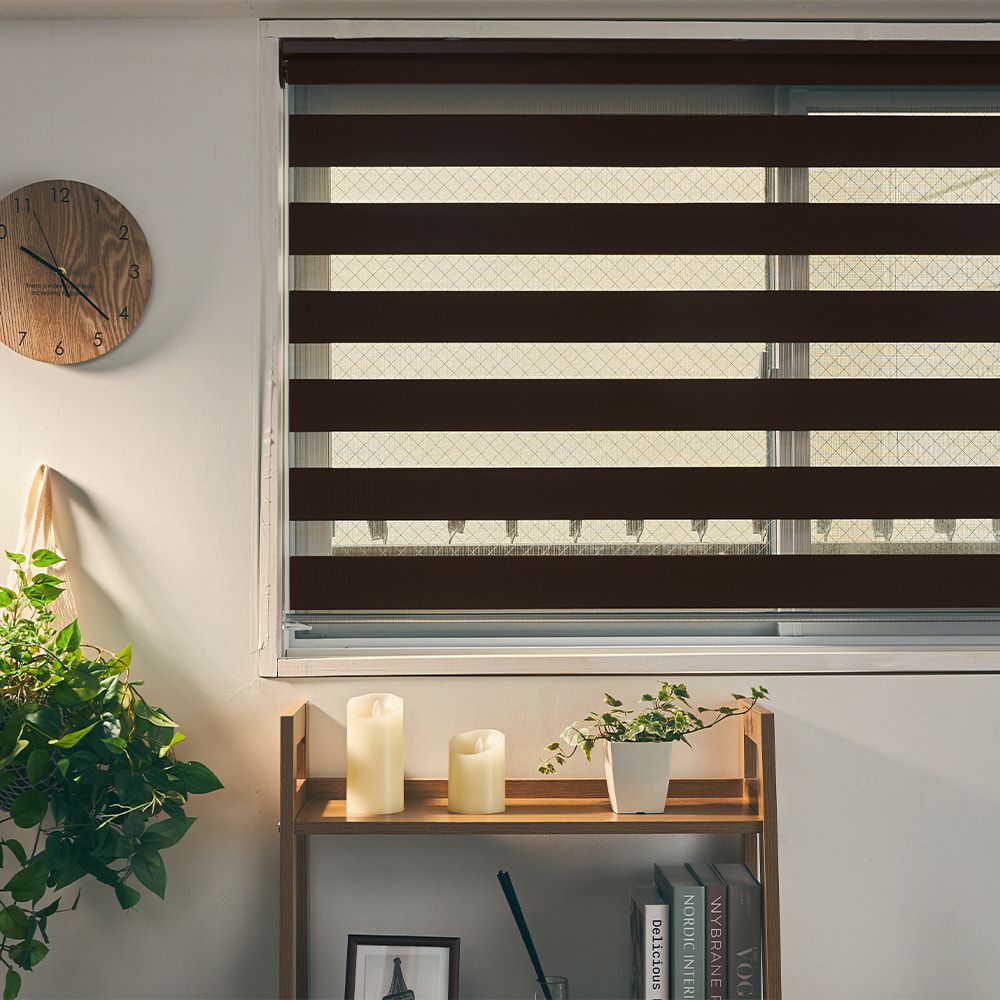 調光ロールスクリーンは、光を透過する生地と光を遮る生地の2種類を組み合わせることで、光量を細かく調節できる仕組みになっています。優しい光と風につつまれながらホット一息を。