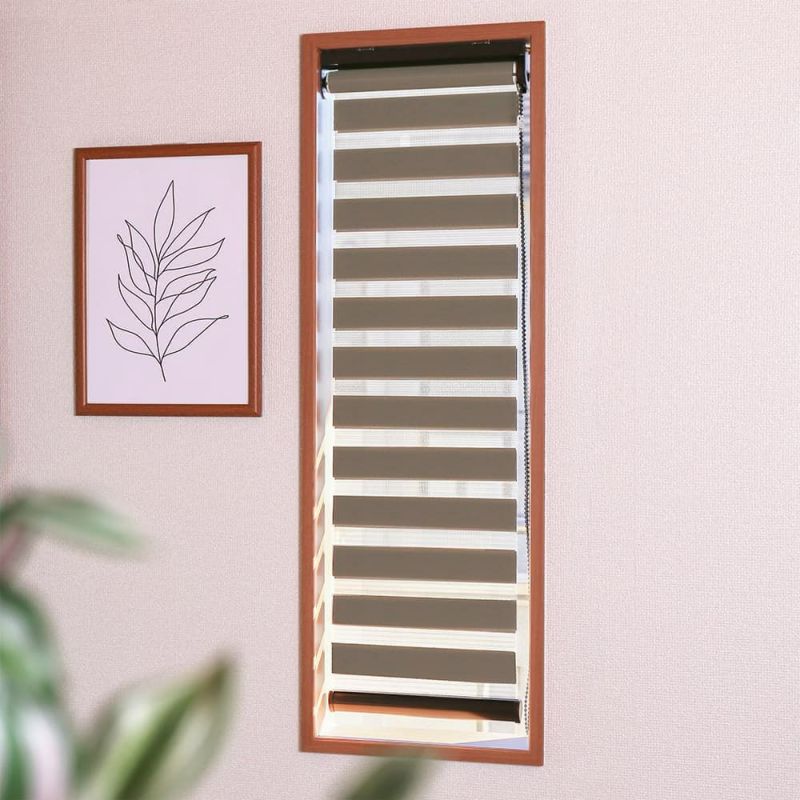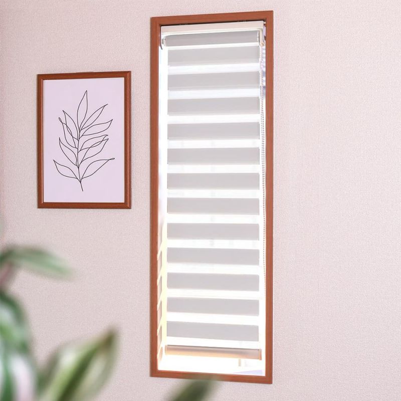 従来の調光ロールスクリーンよりも、細かなボーダー柄が特徴のスリムタイプの調光ロールスクリーン。ボーダーの部分が細いので、外からの視線が気になりにくく、小窓やスリット窓との相性抜群です。