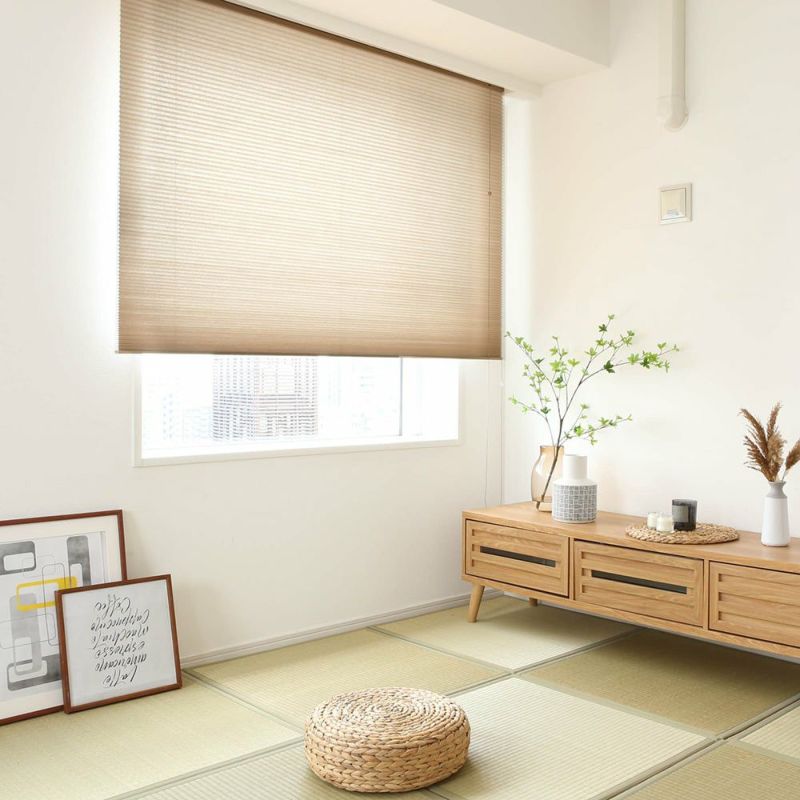 均等に折られたジャバラ生地が美しく、上品な雰囲気に。障子替わりに設置するのもおすすめです。生地を少しだけ上げれば、雪見障子のように外の景色も楽しめます。