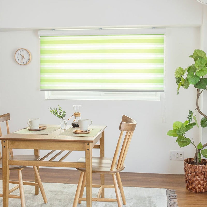 前後2枚に重ねた生地をスライドさせると、ボーダー柄の重なり具合で、ブラインドのように光の入り方を自由に調節できます。横からの光もれを防ぐには、正面付けにしてロールスクリーンのヨコ幅を窓より広めにするのがおすすめ。