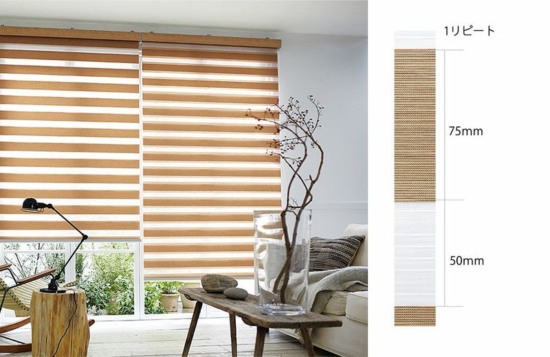 【撮影コーディネート】ドレープカーテン<ミオクラッセ>アイボリー一日を通して、部屋に入る光は刻々と変わります。そんな時には調光ロールスクリーンで光の量を簡単に調節。ボーダーの重なり具合を見たくて、動かしてみたくなってしまうくらい、操作が楽しい事もポイントです。