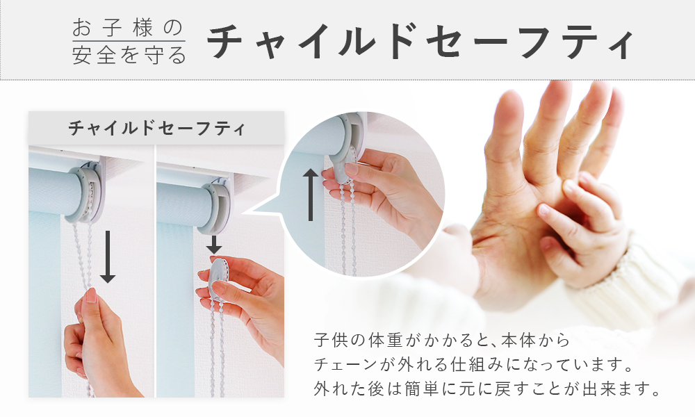 操作チェーンに一定の重さが加わると、本体からチェーンが外れる仕組みになっています。 万が一お子様が誤って引っかかってしまった時に、事故を防ぐ事が出来ます。 *外れたチェーンは簡単に元に戻すことが出来ます。 この独自開発をしたチャイルドセーフティは、子どもたちの安全・安心に貢献するデザインが認められ「KIDS DESIGN AWARD2021」を受賞しています。