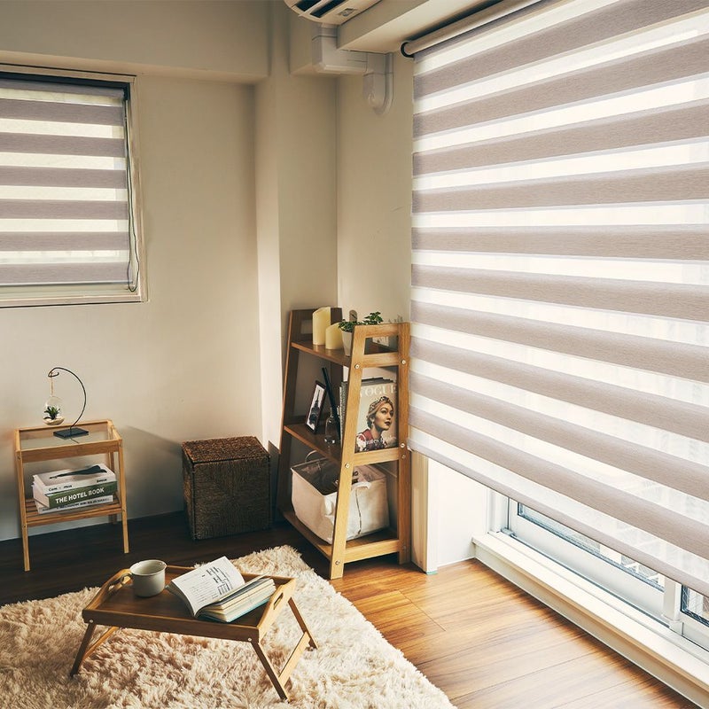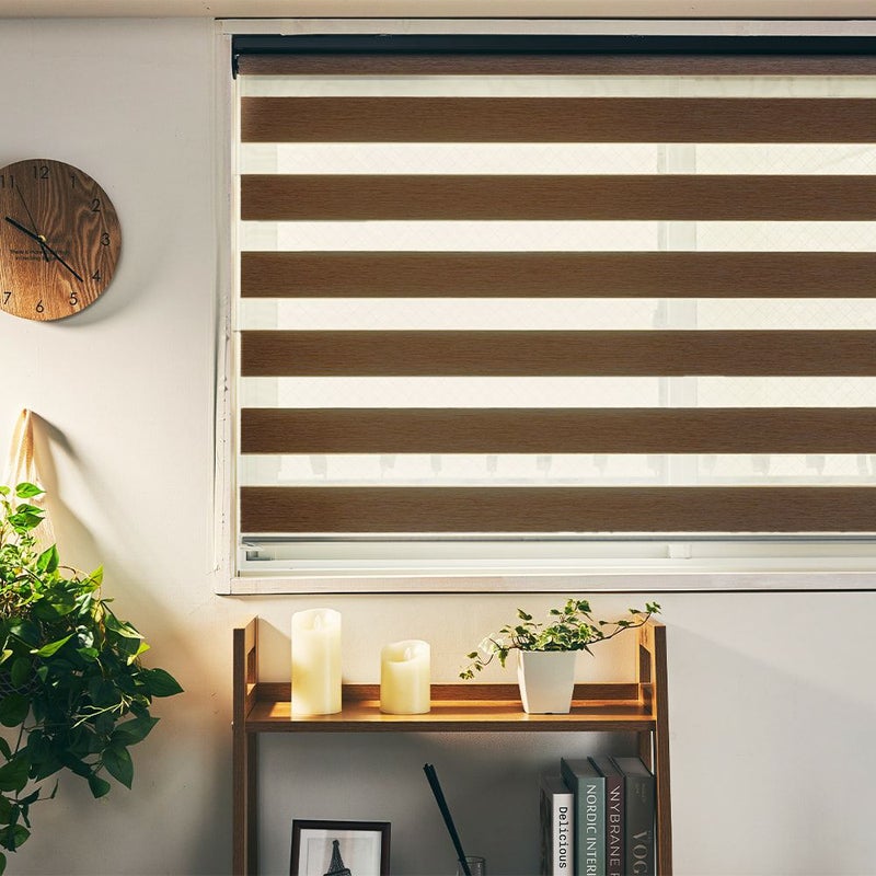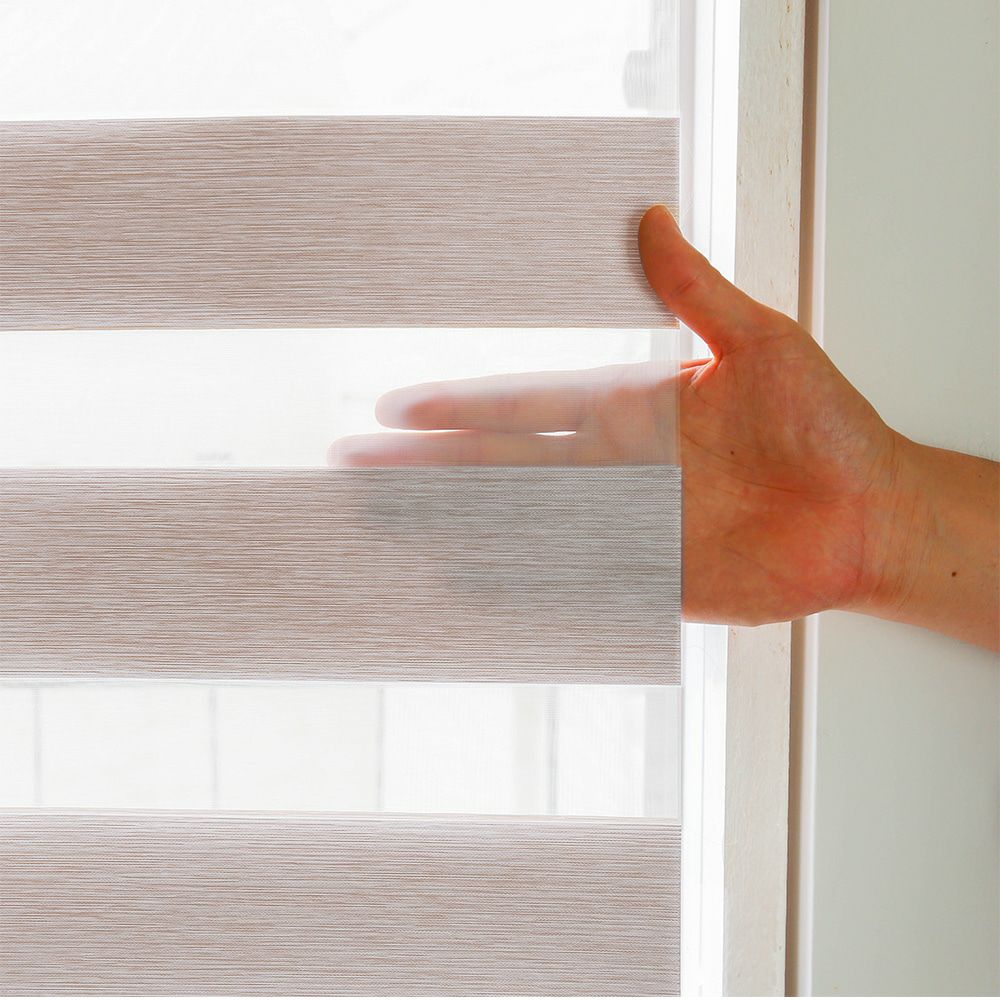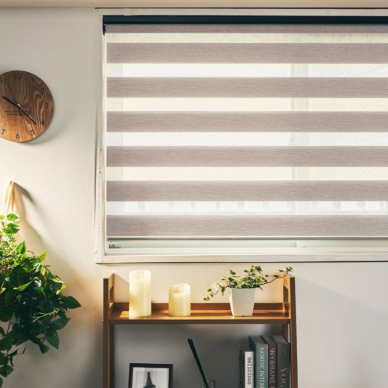 調光ロールスクリーンは、光を透過する生地と光を遮る生地の2種類を組み合わせることで、光量を細かく調節できる仕組みになっています。家にいながら外の景色や陽の光も楽しめる優れもの。