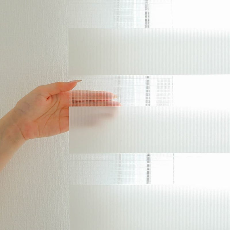 前後2枚に重ねた生地をスライドさせると、ボーダー柄の重なり具合で、ブラインドのように光の入り方を自由に調節できます。横からの光もれを防ぐには、正面付けにしてロールスクリーンのヨコ幅を窓より広めにするのがおすすめ。